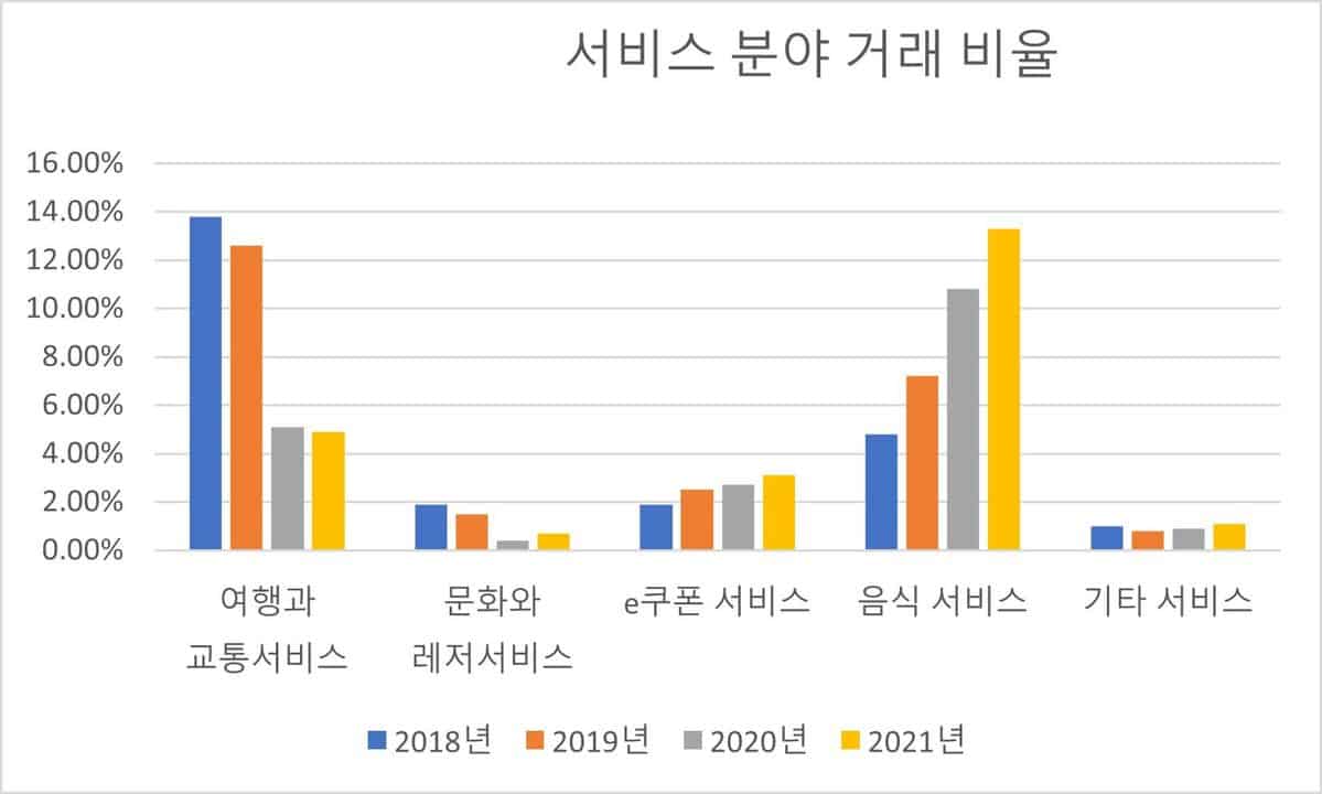 음식서비스의 경우 서비스 분야에서 차지하는 비중이 2018년 4.8% 정도였는데 저 두 분야가 고꾸라지며 2021년에는 13.3%를 차지했다. 2018년과 비교하면 완전 반대다.