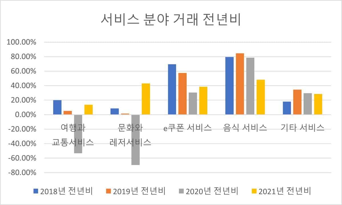 다만 음식 서비스는 2019년이 전년대비 84.6%로 가장 높은 성장을 이뤄냈지만 코로나 맞은 2020년 전년 대비 78.6% 였고 2021년에는 48.2%였다. 음식 서비스 덕에 많은 식당들이 버텨내고 있다고 볼 수 있지만 그래도 2020년은 여파가 있었고 2019년을 정점으로 이제 배달 서비스는 어느 정도 모두 이용하는 기본 서비스가 되면서 시장 파이가 느는 것처럼 보이지만 성장세는 둔화되고 있다.