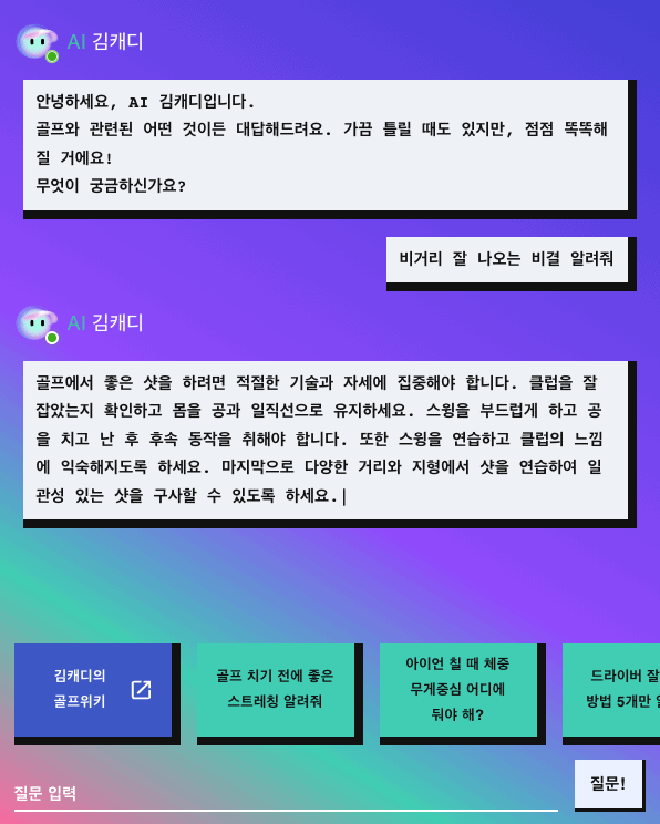 [테크수다 기자 도안구 eyeball@techsuda.com] 골프가 쉬워지는 골프생활 플랫폼 ‘김캐디’가 골프 전문 챗봇 ‘AI 김캐디’ 베타 서비스를 오픈했다.