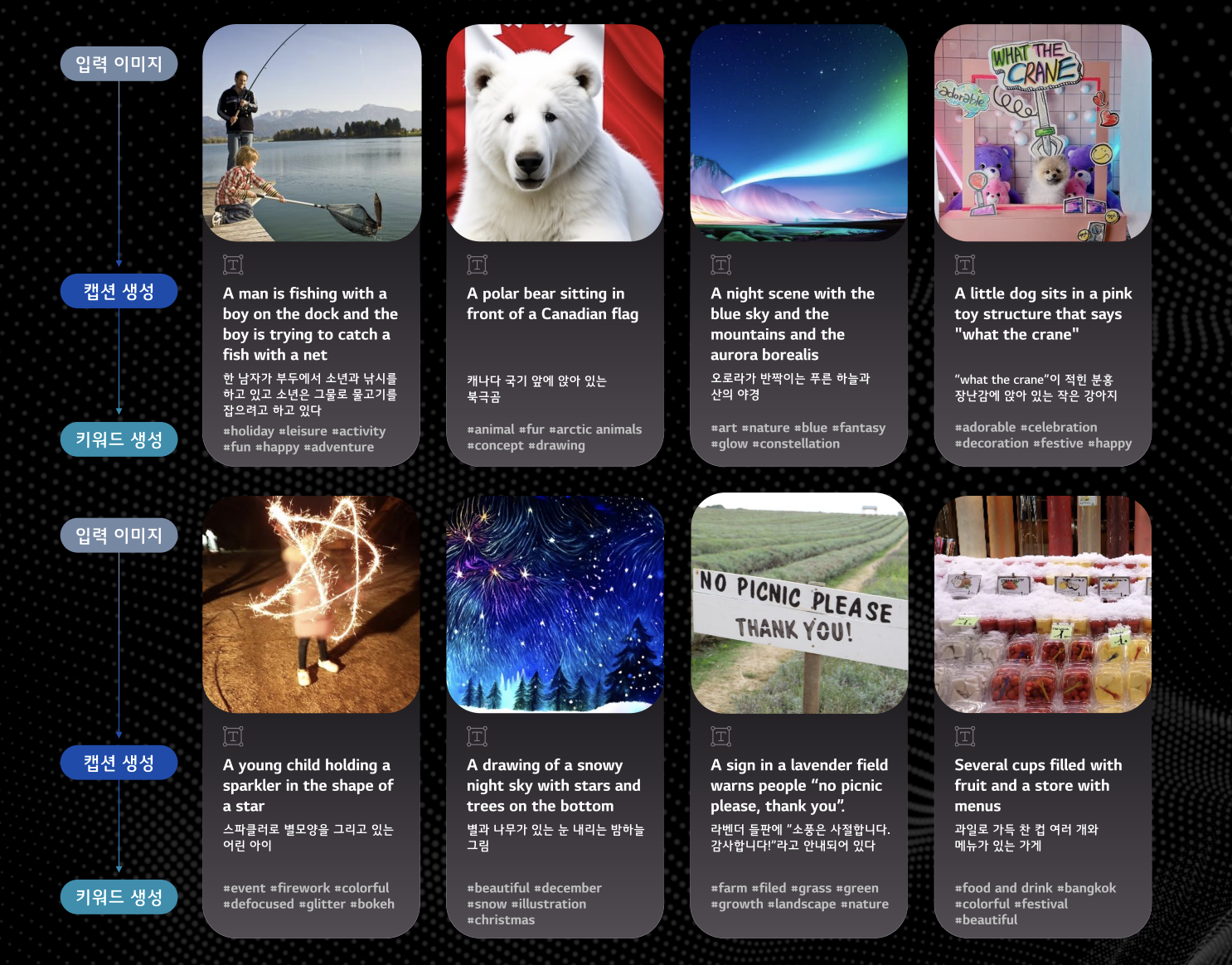 엑사원의 새로운 제로샷 이미지 캡션 솔루션은 생성형 AI를 사용해 인간의 인지 능력과 유사하게, 이전의 경험과 지식, 훈련을 바탕으로, 본 적 없는 객체나 장면을 자동으로 이해하고 설명한다. 이는 엑사원이 한국어와 영어로 된 이미지와 텍스트를 이해하고 인간에 가까운 추론 능력을 활용해 정확하고 상세한 이미지 캡션과 키워드를 작성할 수 있게 한다.