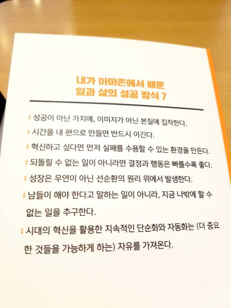 저자의 아마존 경험에서 인상적인 부분은 입사 후 다른 업무의 선택 기회가 있다는 점이다. 타부서로 옮기는 게 국내 기업에서도 가능한 일이지만 그렇게 자유롭지 않다. 직원이 회사가 제공하는 상품의 제작 과정부터 상품 도달 지점까지 직접 경험하면서 회사에 대한 애정은 더 커진다. 전반적인 업무 이해는 촘촘한 기획물을 만들 수 있게 돕는다.