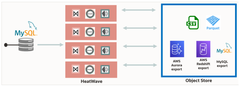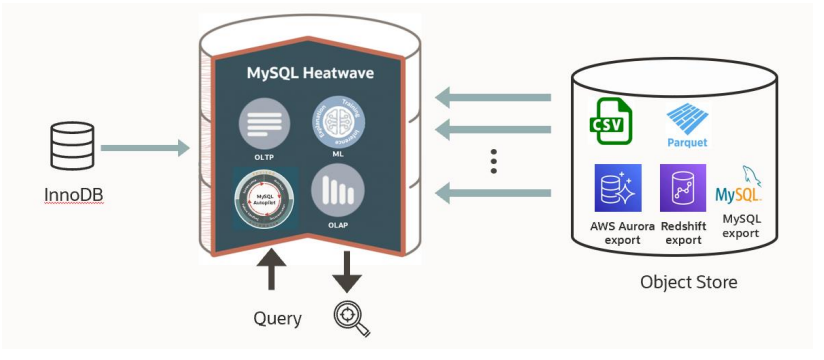 MySQL 히트웨이브 레이크하우스는 CSV, 파케이(Parquet), 다른 데이터베이스의 내보내기 파일 등 다양한 오브젝트 저장소 파일 형식을 지원하며, 동일한 쿼리에서 오브젝트 저장소 파일 데이터와 MySQL 데이터베이스 트랜잭션 데이터를 함께 결합할 수 있다. 오브젝트 저장소 파일은 MySQL 데이터베이스에 데이터를 복제하지 않고 히트웨이브에서 직접 쿼리를 실행한다. 결과적으로 MySQL 히트웨이브 레이크하우스는 쿼리 처리, 데이터 로딩 속도, 클러스터 프로비저닝 시간, 오브젝트 스토리지 내 쿼리 데이터 자동화를 위한 새로운 확장성 및 성능 표준을 세웠다.