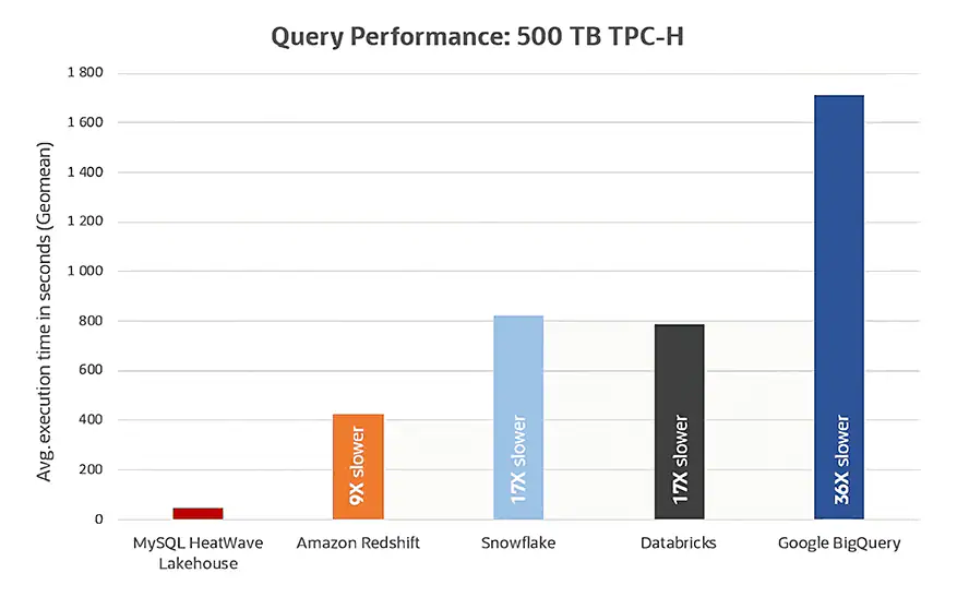 500TB TPC-H* 벤치마크 테스트를 통해 입증된 MySQL 히트웨이브 레이크하우스의 쿼리 성능은 다음과 같다: