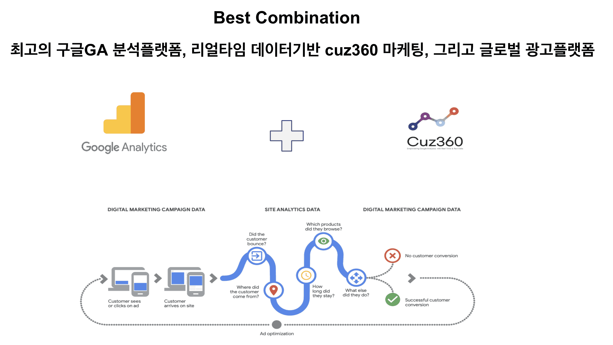 국내외 고객들을 모두 겨냥한 커즈360은 데이터 범용성과 정확성을 위해 전세계 사실상의 표준 지위를 확보한 구글분석(GA: Google Analytics 이하 GA) 데이터를 활용한다. 웹사이트나 쇼핑몰들은 GA 라이브러리를 자사의 사이트에 설치한 후 구글이 제공하는 분석 대시보드를 무료로 이용해 고객을 분석하고 있다.