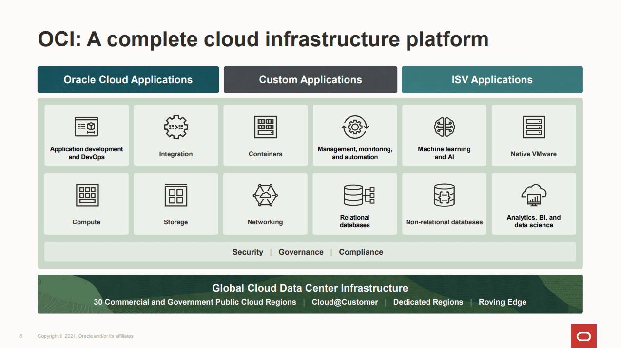 로스 브라운(Ross Brown) 오라클 제품 시장전략 부사장(VP, Product Go-To-Market)은 "오라클은 클라우드를 위해 관련 비즈니스를 완전히 재구축했다"고 밝히고 "모든 주요 비즈니스 애플리케이션의 최신 SaaS 버전 구축, 70개 이상의 고유 서비스를 제공하는 완전히 새로운 클라우드 인프라 플랫폼, 클라우드에 대한 가장 유연한 접근 방식: 에지에서 데이터 센터인 퍼블릭 클라우드, 재정적으로 지원되는 종단 간 SLA를 제공하는 유일한 클라우드 제공업체"라고 강조했다.