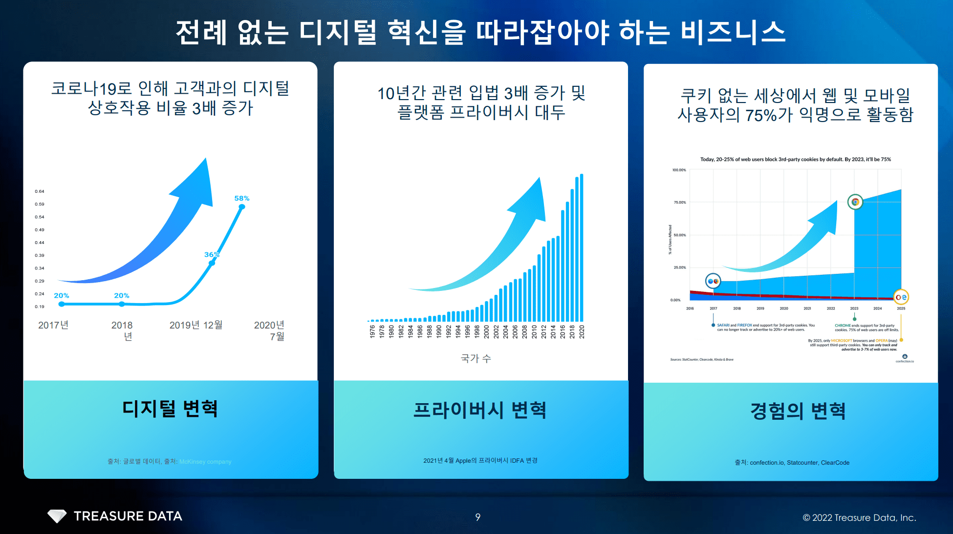 이와 더불어 10년간 개인정보보호와 프라이버스 관련 입법이 전세계적으로 3배 증가했고 플랫폼 사업자들에 대한 규제 이슈도 늘었다. 이런 연장선에서 서드 파티 쿠키를 활용하지 못하도록 하면서 새로운 관점과 데이터를 활용한 고객 이해는 필수적이 되었다. 문제는 고객의 익명성과 고객 파악을 위해 마련된 기업 내 부서별 사일로 시스템의 증가로 인해서 고객에 대한 단일 뷰를 마련하는데 어려움을 겪고 있다.