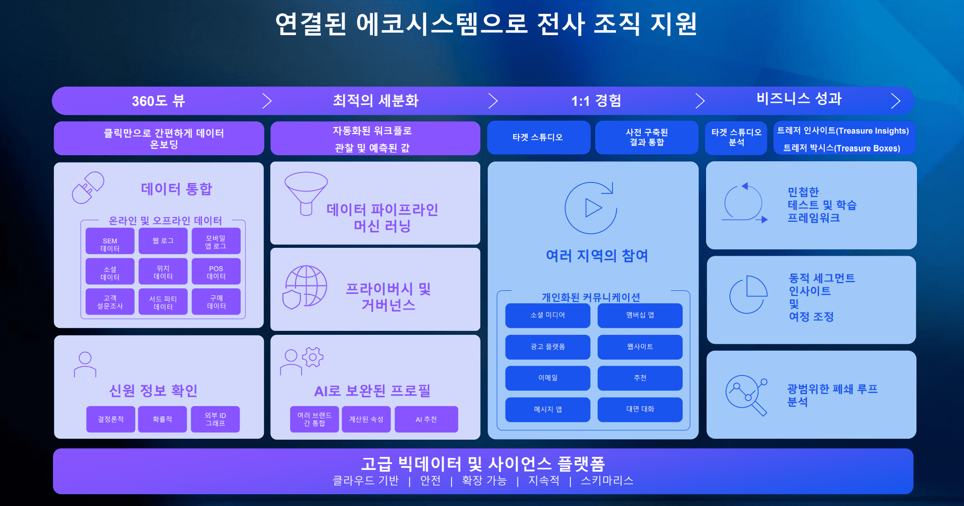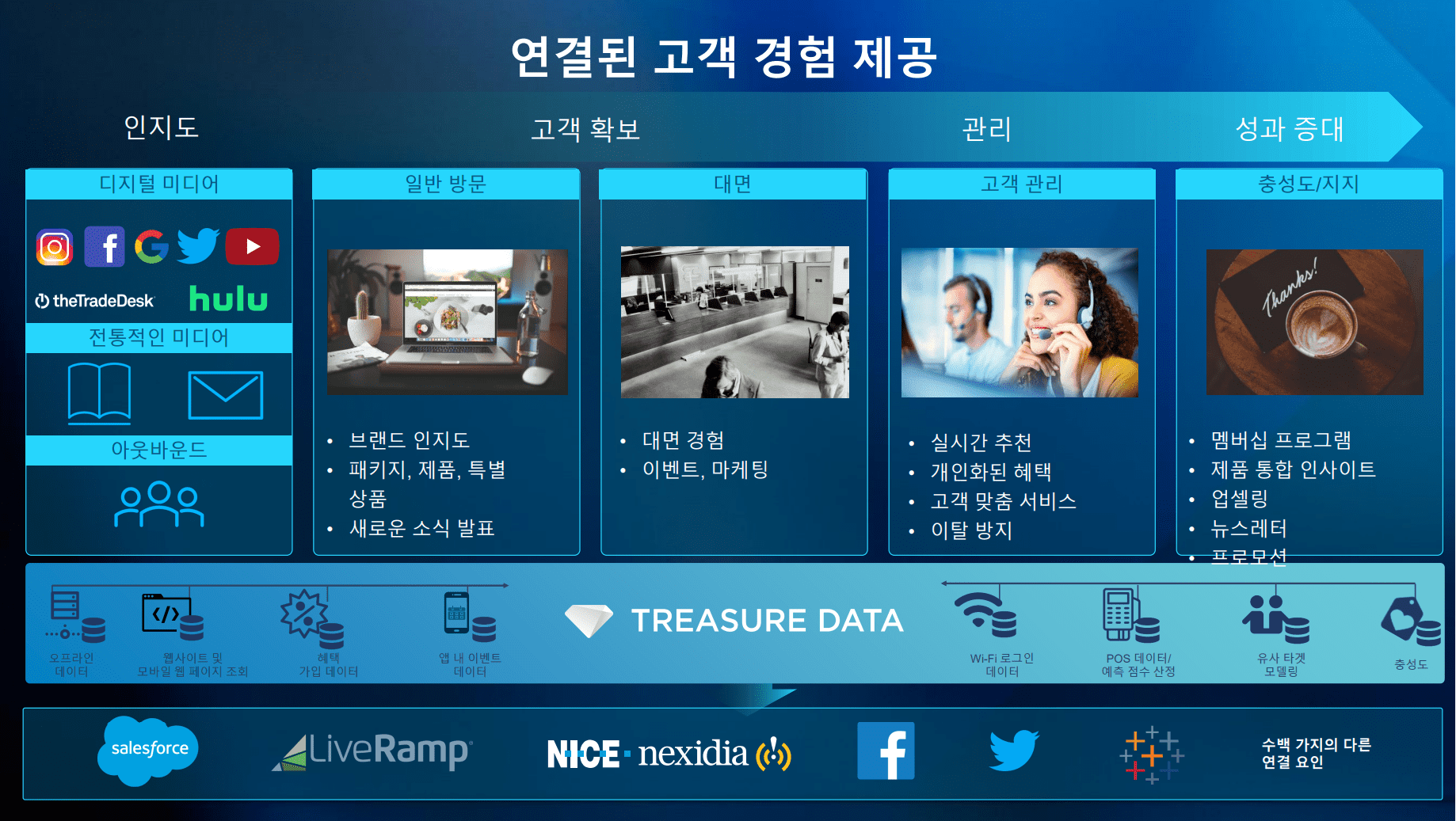 트레저데이터는 파편화된 데이터로부터 동일 고객을 식별하고 마케팅, 서비스, 판매를 위한 통합 고객 프로필을 구성해 신규 고객 확보 최적화, 알려지지 않은 사용자와 알려진 사용자의 전환 증대, 디지털과 대면 모두 연결된 개인화, 대면 대화 최적화, 고객 총성도 제공 같은 고객 경험을 제공할 수 있도록 돕는다.