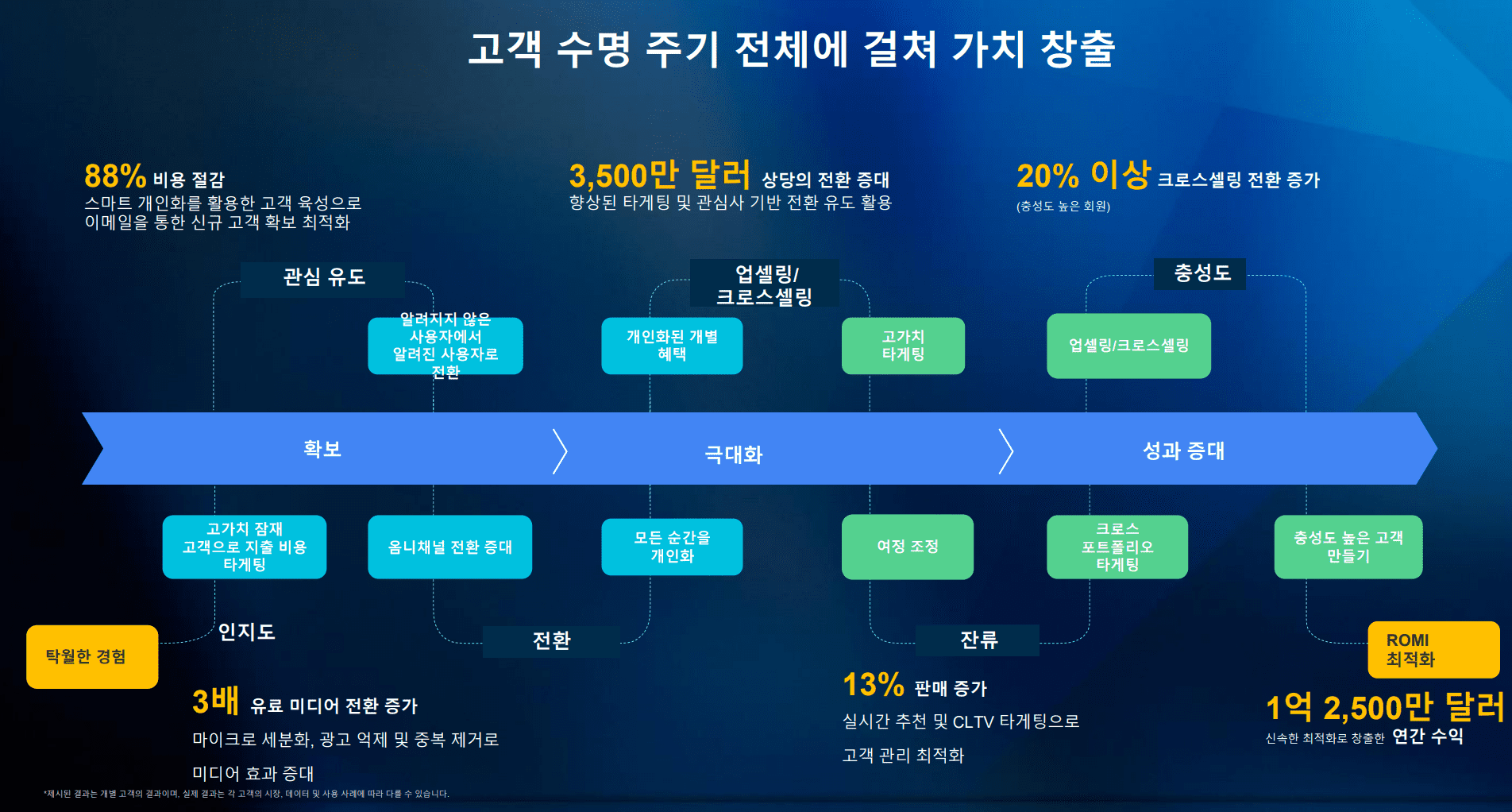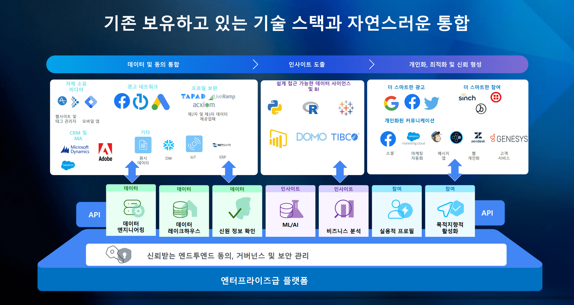 고 대표는 "고객데이터플랫폼은 데이터 사일로(파편화)를 해결할 수 있을 뿐만 아니라 신규 고객 확보 및 고객 생애 가치 증대, 비즈니스 프로세스 최적화 측면에서 탁월한 개인화된 고객경험을 제공할 수 있다"며 "CDP를 활용하면 누구에게 언제 어느 채널로 무엇을 어떻게 제안할지에 대한 통찰력을 제공하고, 그에 따른 실행을 자동화함으로써 실질적인 성과를 내는 초개인화를 이루어낼 수 있다”고 강조했다.