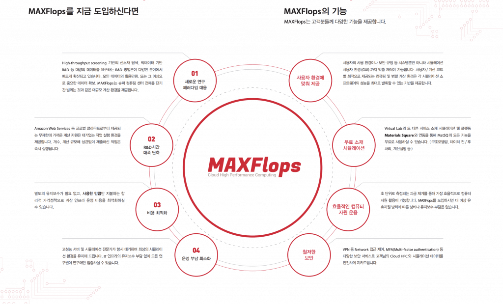 맥스플롭스(MAXFlops)는 즉시 작업 제출이 가능한 무제한 클라우드 HPC 서비스다. 이 서비스는 AI 기반 R&D 등 최신 연구 트렌드에 대응하기 위한 최적의 시뮬레이션 환경을 제공한다. 무제한 컴퓨팅 서버 풀에서 대기없이 2000개 이상의 작업을 동시에 실행 할 수 있으며, 유지 보수나 공간 걱정 없이 최소한의 투자로 슈퍼 컴퓨팅을 구현할 수 있다. 엔비디아 그래픽 카드 환경을 지원한다.