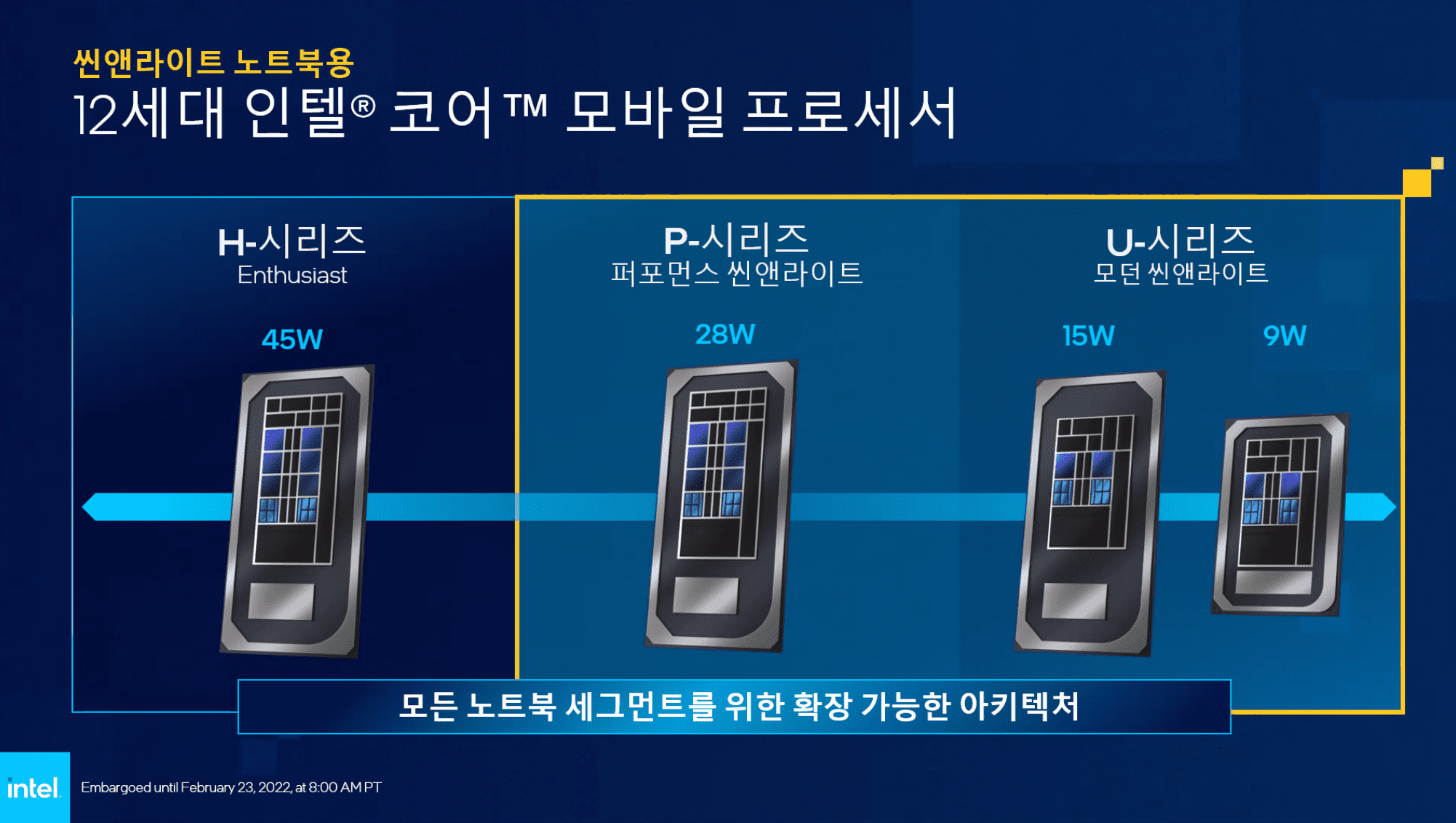 뛰어난 성능과 생산성을 위해 설계된 총 20개의 신규 모바일 프로세서는 차세대 씬앤라이트 노트북에 탑재될 예정이다. 삼성전자와 LG를 비롯, 에이서, 에이수스, 델, 후지쯔, HP, 레노버, MSI, NEC 등 제조사는 올해 3월을 시작으로 250개 이상의 12세대 인텔 코어 P 시리즈 및 U 시리즈 프로세서가 탑재된 제품을 출시할 예정이다.