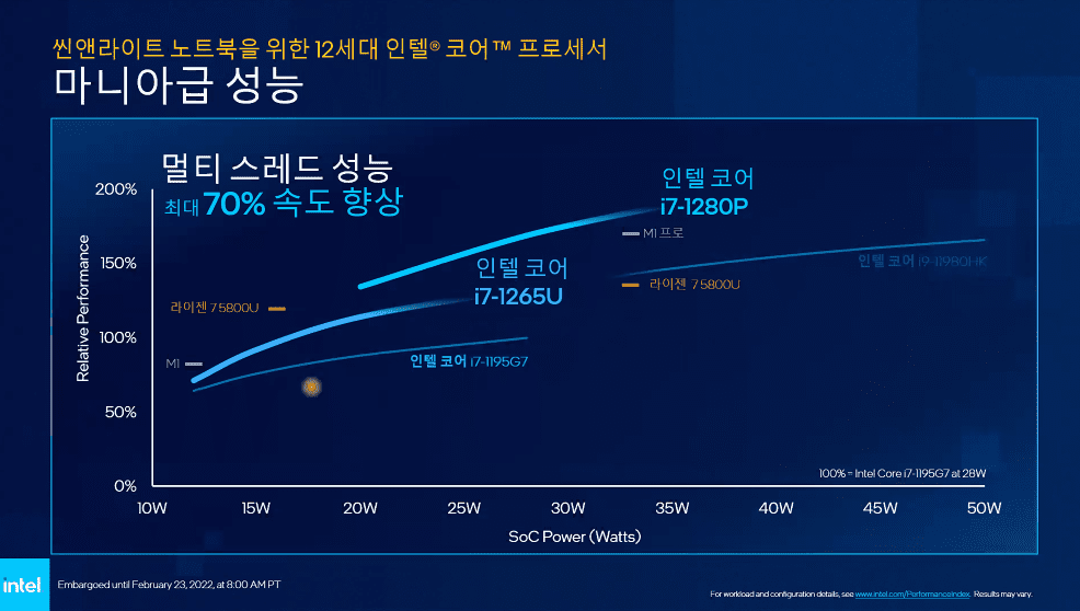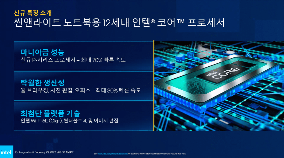 인텔7 공정이 제공하는 와트당 성능 이점을 최대한 활용하는 신규 씬앤라이트용 12세대 인텔 코어 모바일 프로세서는 아래와 같은 사양과 성능을 제공한다: