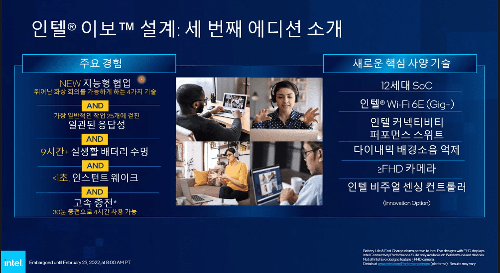 세 번째 에디션 사양인 인텔 이보(Intel Evo) 인증을 획득하고자 하는 노트북은 가장 많은 작업 부하를 처리해야 하며, 뛰어난 응답성, 인스턴트 웨이크, 실제 배터리 수명 및 급속 충전뿐 아니라 탁월한 화상회의 환경을 제공하는지 여부에 대한 실제적인 검증 절차를 거치게 될 예정이다. 12세대 인텔 코어 모바일 프로세서를 탑재한 인텔 이보 인증 노트북은 뛰어난 연결성을 유지하면서 높은 품질의 이미지와 그룹 화상 통화를 지원하는 등 멀티태스킹에 최적화되어 있다.