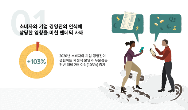 - 기업 경영진 사이에서 재정에 대한 불안과 스트레스는 186%, 우울감은 116% 증가했다. 소비자 또한 재정적 불안과 스트레스를 2배 더, 슬픈 감정 또한 70% 더 느낀다고 응답했다.