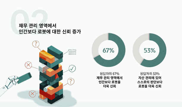 이러한 재정적 불확실성은 재무 관리 영역에서 사람들이 신뢰하는 대상에 변화를 가져왔다. 특히, 복잡한 재정적 문제를 해결하는데 있어 소비자와 기업 경영진은 사람보다 AI를 포함한 기술을 더욱 신뢰하고 있는 것으로 나타났다.