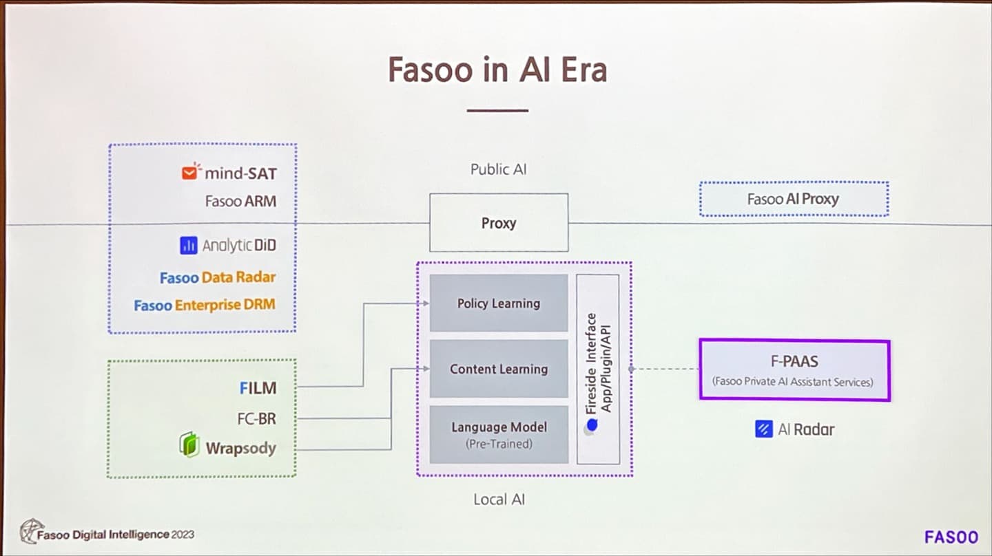 조대표는 AI 활용을 위한 신규 솔루션으로 ‘F-PAAS(Fasoo Private AI Assistant Service, 파수 프라이빗 AI 어시스턴트 서비스-가칭)’와 ‘파수 퍼블릭 AI 프록시(Fasoo Pubilc AI Proxy-가칭)’를 소개했다.