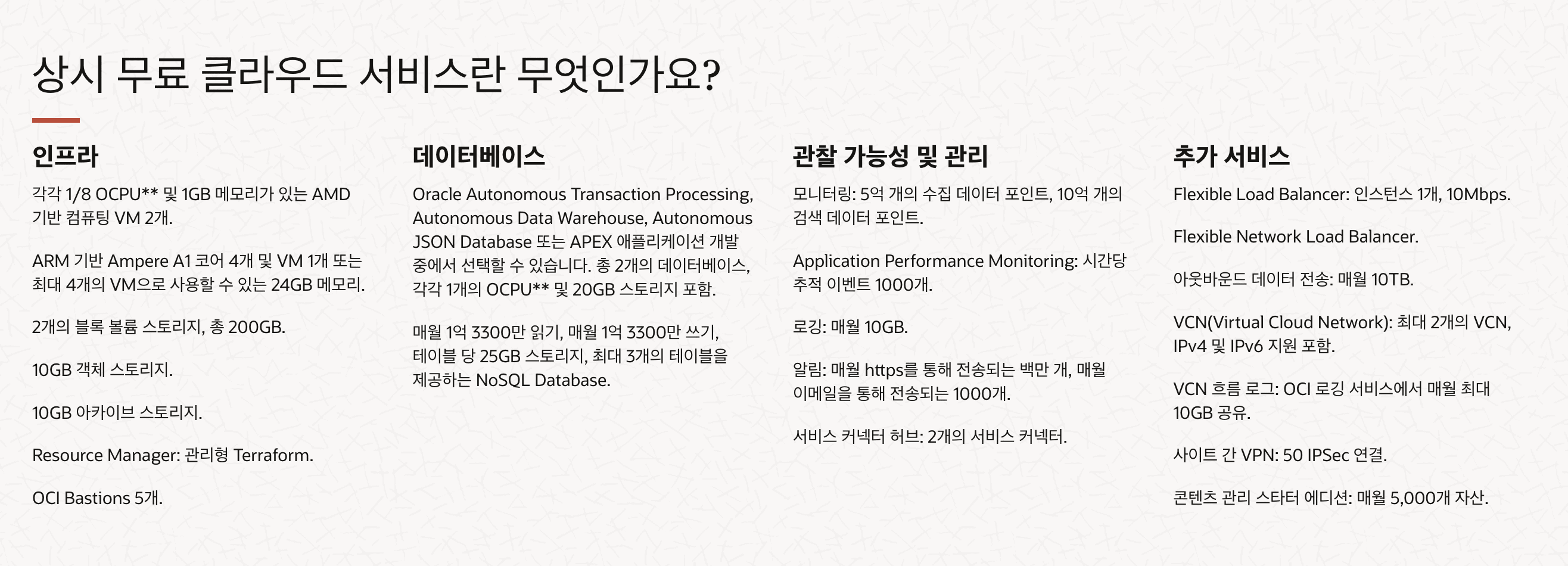 상시 무료 클라우드 서비스는 로우 코드 플랫폼인 오라클 APEX와 Oracle SQL 디벨로퍼가 제공되는 오라클 자율운영 데이터베이스 2개, AMD 컴퓨팅 VM 2개, ARM AMpere AI 컴퓨팅 인스턴스 최대 4개, 블록과개체, 마아키브 스토리지, 로드밸런서와 데이터 송신이 제동된다.
