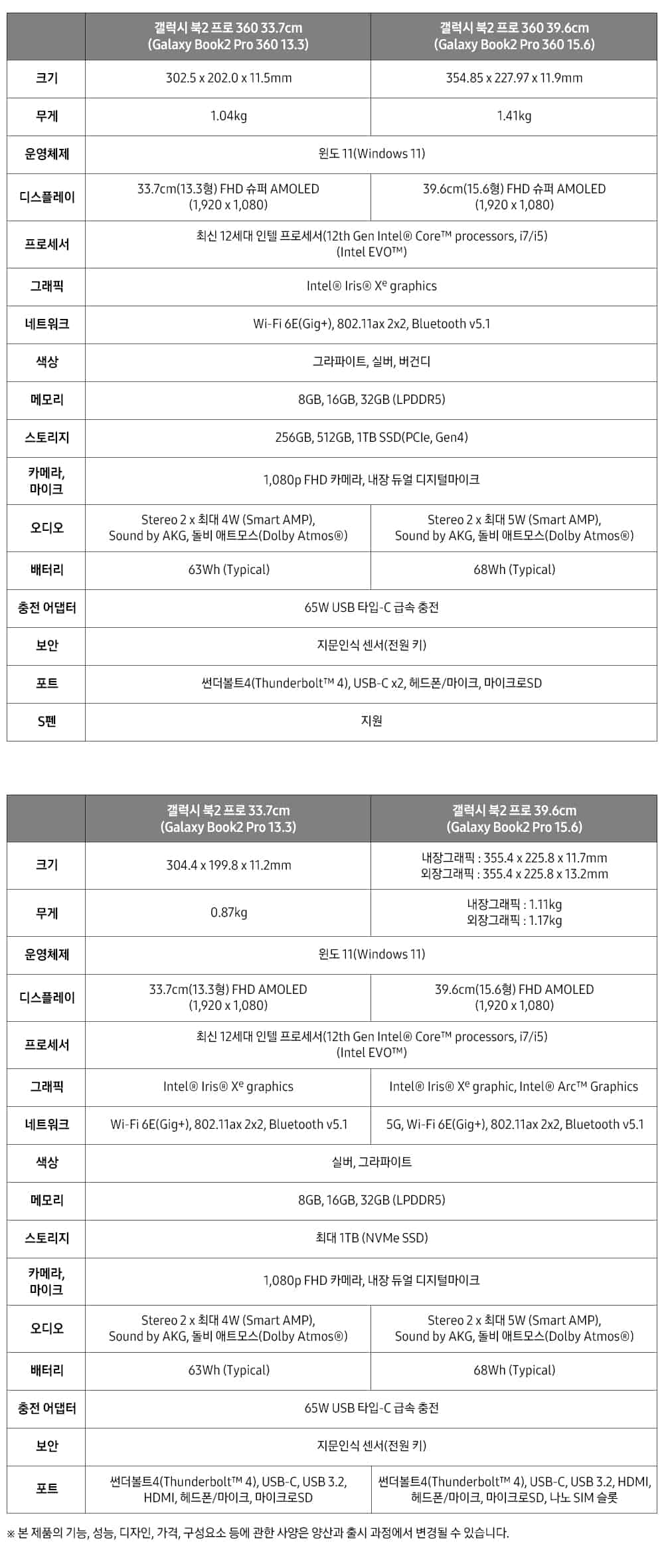 ‘갤럭시 북2 프로’ 시리즈는 외장 그래픽 카드 모델을 제외한 전 모델이 11mm대로 얇으며, 특히, ‘갤럭시 북2 프로’ 13.3형 모델은 11.2mm 두께에 무게는 870g에 불과하다.