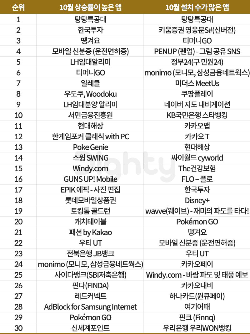 [테크수다 기자 도안구 eyeball@techsuda.com] 엔에이치엔 데이터(NHN DATA, 대표 이진수, 이하 NHN데이터)의 데이터 인사이트 아카이브 다이티(Dighty) 블로그가 ‘10월 설치 급상승 앱 TOP 10’을 발표했다.