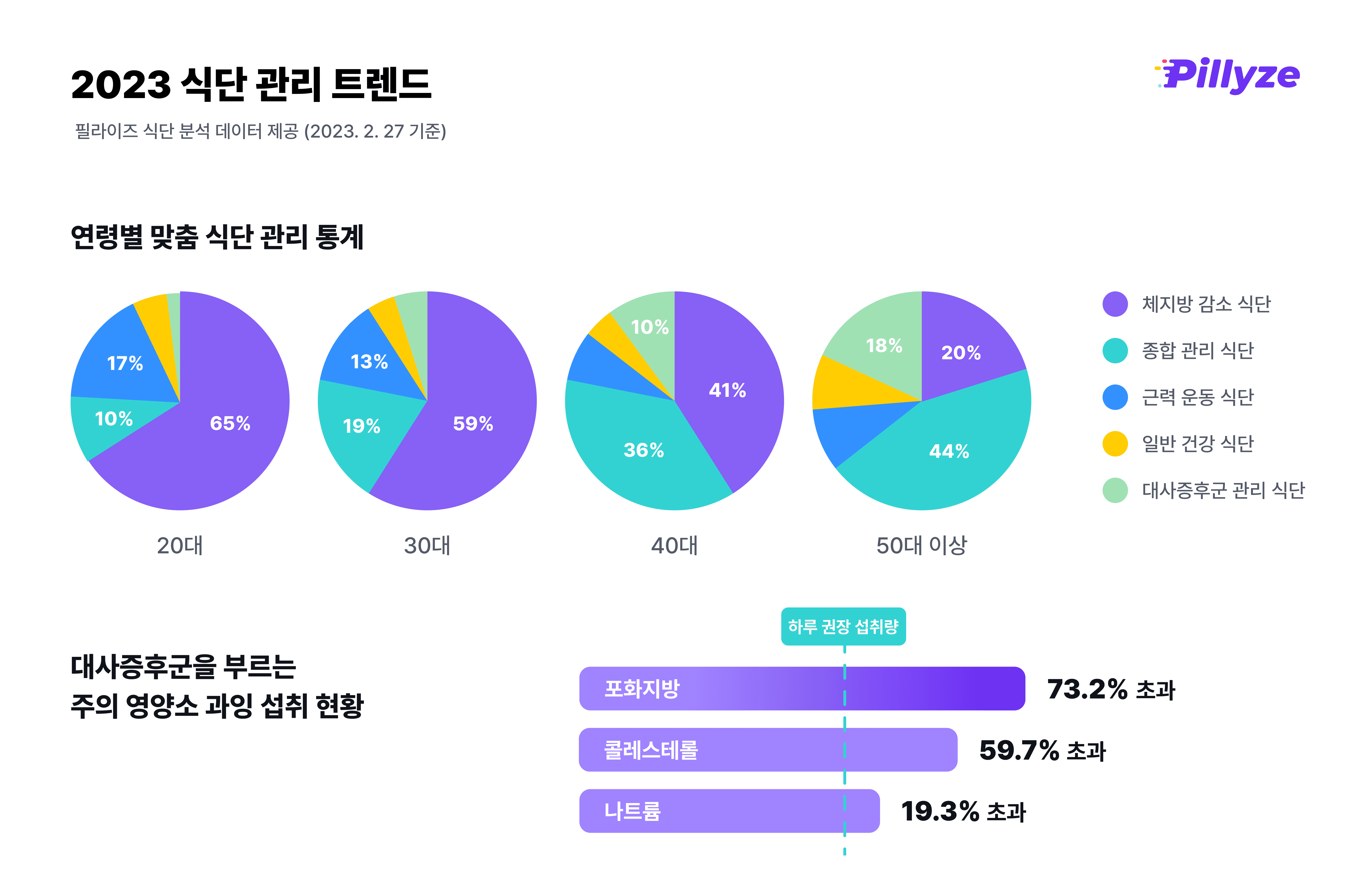 [테크수다 기자 도안구 eyeball@techsuda.com] 초개인화 영양 관리 앱 필라이즈(대표 신인식 www.pillyze.com)가 올 1월 출시한 식단 맞춤 기능 사용 데이터를 분석한 결과, 대사 증후군 관리 등 건강 관리 관점에서 식단 기능을 적극적으로 활용하기 시작하는 연령대는 30대이고, 모든 연령층에서 지방과 포화 지방 섭취량이 일일 권장 기준치를 크게 웃도는 것으로 나타났다고 28일 밝혔다.