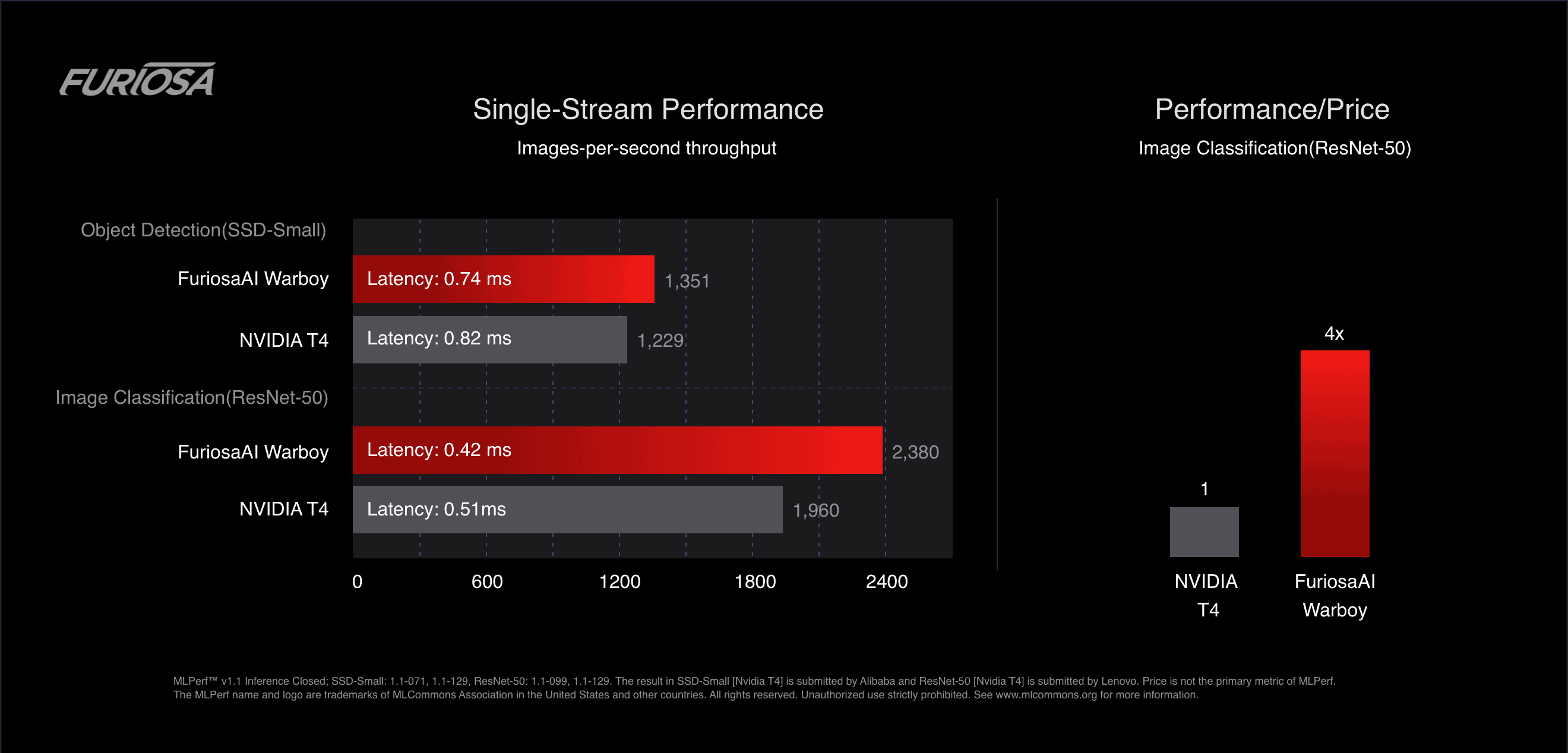 퓨리오사AI의 Warboy는 고성능 컴퓨터비전을 타겟한 실리콘 칩이다. MLPerf 결과에 따르면, 엔비디아(Nvidia)의 T4보다 이미지 분류(ResNet-50)와 객체 검출(SSD-Small)의 처리 속도(single stream) 면에서 뛰어난 성능을 기록했다. 또한, 가격과 트랜지스터 개수 등에서 10배 이상 차이가 나는 엔비디아의 최신 플래그십 제품인 A100의 단일 인스턴스와 대등한 수준의 성능을 기록했다.
