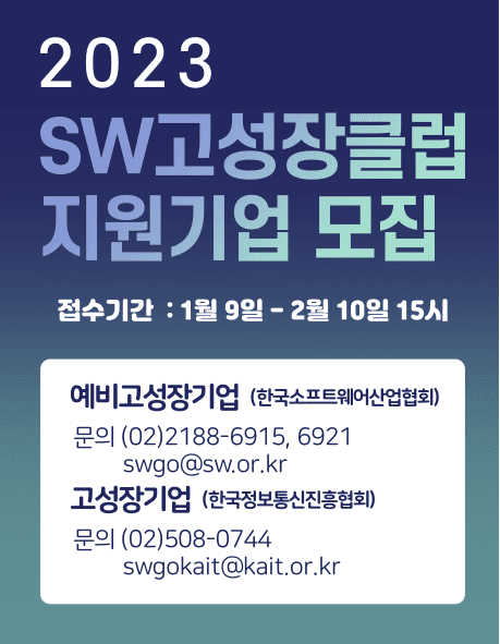 [테크수다 기자 도안구 eyeball@techsuda.com] 한국소프트웨어산업협회(회장 조준희, 이하 KOSA)가 오는 2월 10일까지 2023년 소프트웨어 (SW) 고성장클럽 지원기업을 모집한다고 밝혔다.
