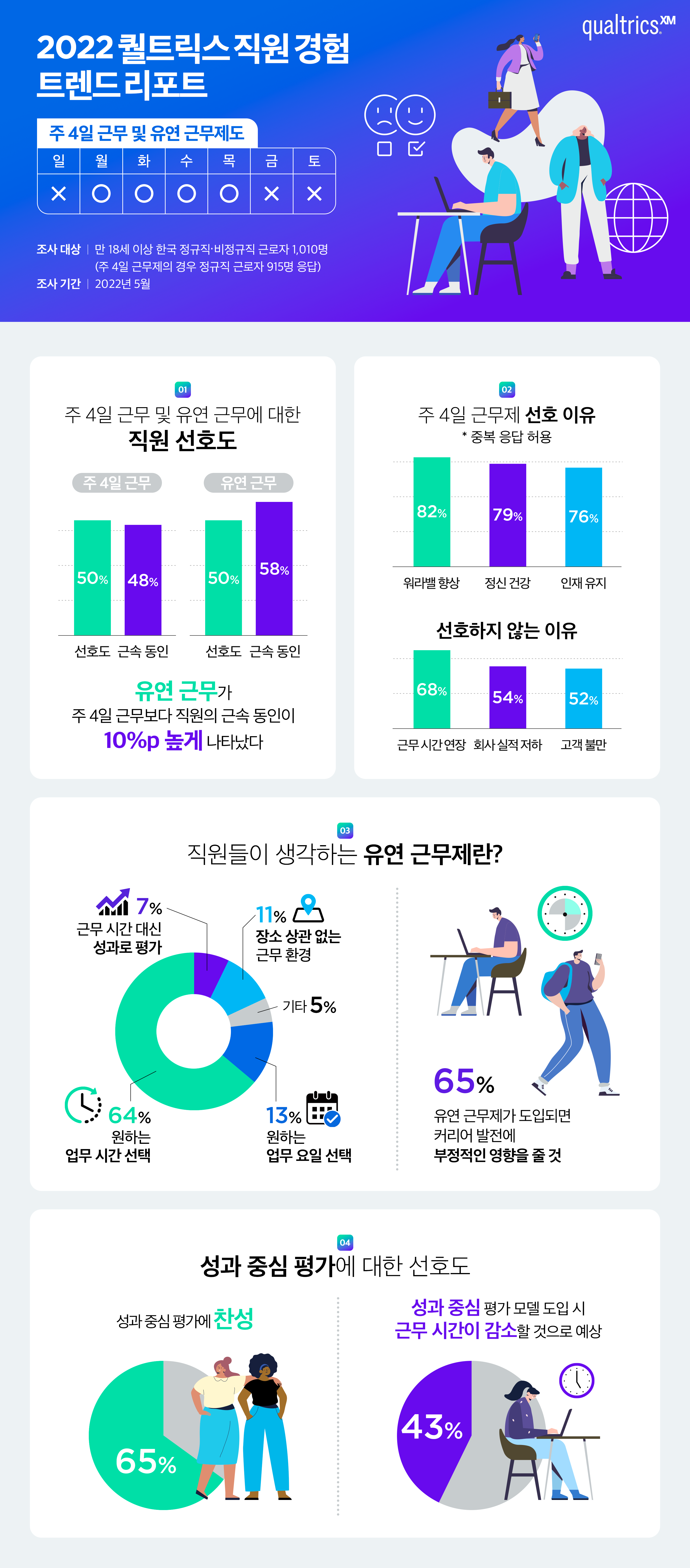 국내에서 근무 방식 유연화에 대한 논의가 활성화되면서 기업의 근무 형태도 하나의 비즈니스 경쟁력으로 떠오르고 있다. 이러한 추세에 맞춰 퀄트릭스는 올해 5월 기준 만 18세 이상 한국 정규직⋅비정규직 근로자 1,010명을 대상으로 새로운 근무 방식에 대해 조사를 진행했다. 보고서는 한국의 근로 정책이 변화하기에 앞서, 기업이 직원의 요구와 기대를 살펴보고 그에 맞게 새로운 근무 제도를 도입하는 것뿐만 아니라 개인과 비즈니스에 미칠 영향도 정확히 파악하는 것이 중요하다고 강조했다.