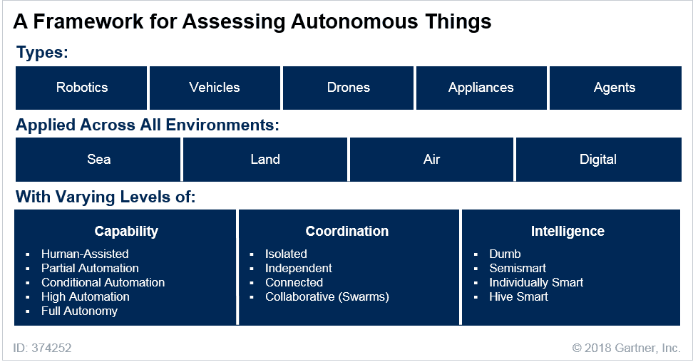 로봇, 드론, 자율주행차 등과 같은 자율 사물(Autonomous Things)은 AI를 이용해 인간이 수행하던 기능들을 자동화한다.이들이 제공하는 자동화는 엄격한 프로그래밍 모델을 통한 자동화의 수준을 뛰어 넘고, AI를 활용하여 주변 환경 및 사람들과 자연스럽게 상호작용하는 고급 행동을 선보인다.