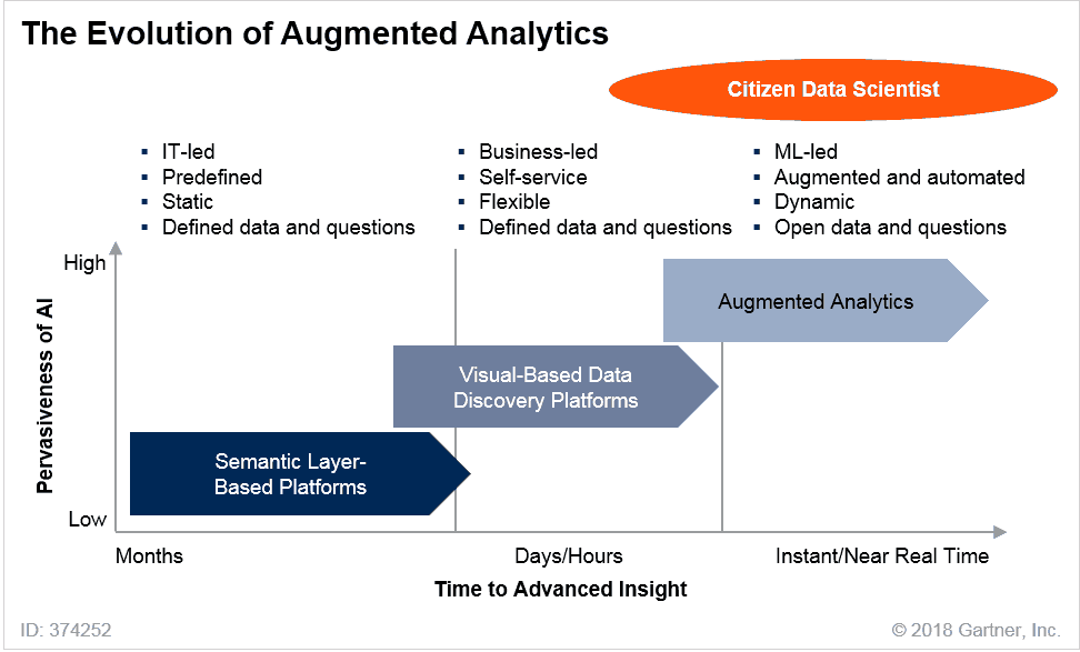 증강 분석(Augmented Analytics)은 분석 콘텐츠가 개발, 소비 및 공유되는 방식을 혁신하기 위해 머신러닝을 이용하여 증강 지능의 특정 영역에 초점을 맞춘다. 증강 분석 기능은 데이터 준비, 데이터 관리, 최신 분석, 비즈니스 프로세스 관리, 프로세스 마이닝 및 데이터 사이언스 플랫폼의 주요 기능으로 빠르게 발전할 것이다. 증강 분석으로부터 얻은 자동화된 통찰력은 HR, 재무, 영업, 마케팅, 고객 서비스, 구매조달 및 자산관리 부서 등의 기업 활동에 적용되어, 애널리스트나 데이터 과학자를 포함한 모든 직원들의 결정과 행동을 최적화할 것이다. 증강 분석은 데이터 준비, 통찰력 생성 및 통찰력의 시각화 프로세스를 자동화하여 많은 상황에서 전문 데이터 과학자가 필요하지 않게 된다.