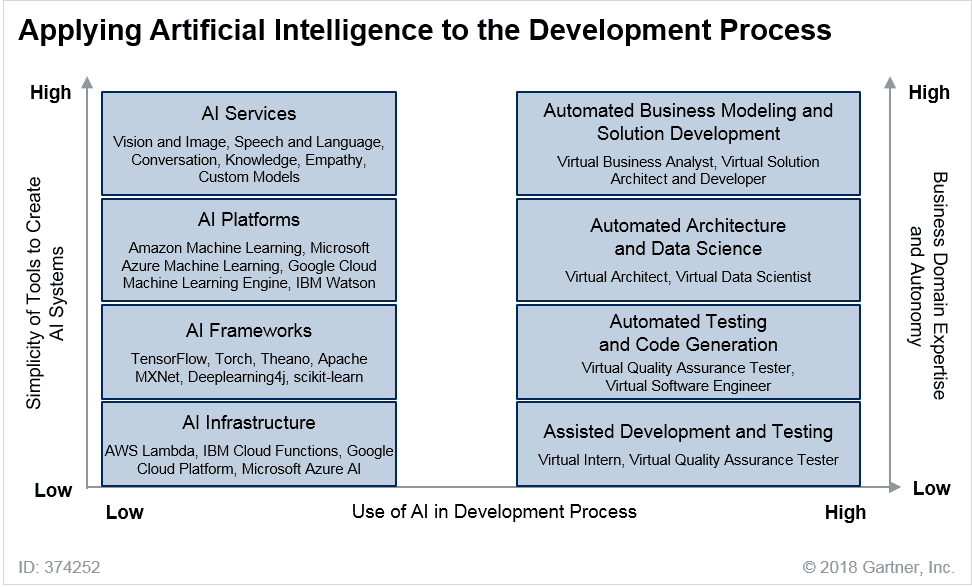 그간 대부분의 AI 강화 솔루션을 만들기 위해 전문 데이터 과학자들이 애플리케이션 개발자와 협력해야만 했던 접근 방식에서 벗어나, 전문 개발자들이 서비스형 사전 정의 모델을 사용하여 단독으로 운영할 수 있는 모델로 시장이 빠르게 변화하고 있다. 이는 개발자에게 AI 알고리즘 및 모델 생태계는 물론, 모델 및 AI 역량을 솔루션에 통합하도록 설계된 개발 툴을 제공한다. 다양한 데이터 과학, 애플리케이션 개발, 테스트 기능을 자동화하기 위해 AI가 개발 프로세스 자체에 적용되면서, 또 다른 수준의 전문 애플리케이션 개발 기회가 발생한다. 2022년에 이르면 새로운 애플리케이션 개발 프로젝트 중 최소 40%가 해당 팀에 AI 공동개발자가 소속되어 있을 것으로 예상된다.