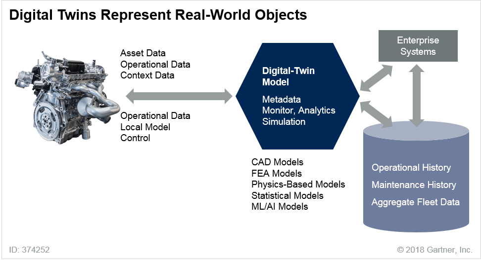 디지털 트윈(Digital Twin)은 현실 세계에 존재하는 대상이나 시스템의 디지털 버전을 말한다. 가트너는 2020년까지 200억 개 이상의 커넥티드 센서 및 엔드포인트가 생성될 것으로 예상하며, 잠재적으로 수십억 개에 달하는 사물에 디지털 트윈이 존재할 것으로 내다봤다. 조직들은 처음에는 간단한 방식으로 디지털 트윈을 적용할 것이다. 시간이 지나면서 이들은 올바른 데이터를 수집 및 시각화하고, 올바른 분석과 규칙을 적용하며, 비즈니스 목표에 효과적으로 대응할 수 있는 역량을 향상시키면서 진화할 것이다.