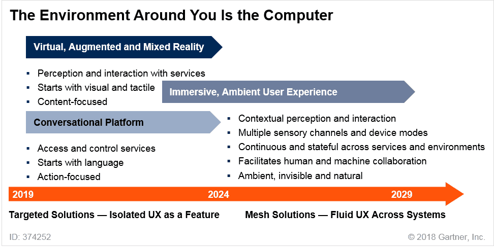 데이비드 설리 부사장은 "시간이 지나면서 우리는 개별 디바이스와 단편적인 사용자 인터페이스(UI) 기술에서 벗어나,다중 채널 및 다중 모드 경험으로 생각을 전환할 것이다. 다중 모드 경험은 기존의 컴퓨팅 디바이스, 웨어러블 기기, 자동차, 환경 센서와 가전제품을 포함한 수백개의 에지 디바이스를 아우르는 디지털 세상과 사람들을 연결시켜줄 것"이라며, "다중 채널 경험은 모든 인간의 감각을 이용할 뿐만 아니라 다중 모드 디바이스의 고급 컴퓨터 감각(열, 습도, 레이더 등)을 모두 활용한다. 이러한 다중 경험 환경은 개별 장치가 아닌 우리를 둘러싼 공간이 "컴퓨터"를 정의하게 되는 앰비언트 경험(ambient experience)을 제공한다. 사실상 환경이 컴퓨터가 되는 것"이라고 말했다.