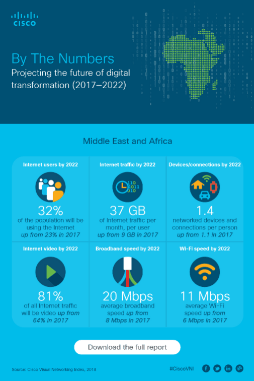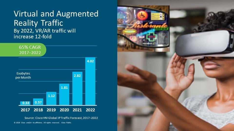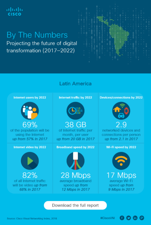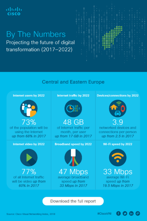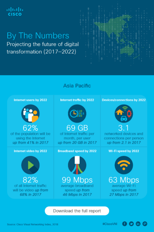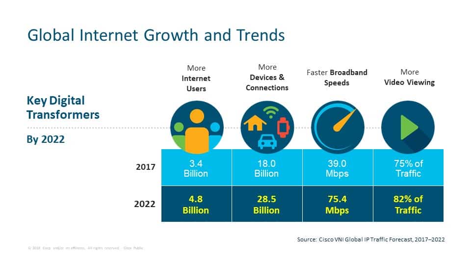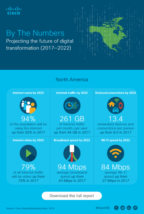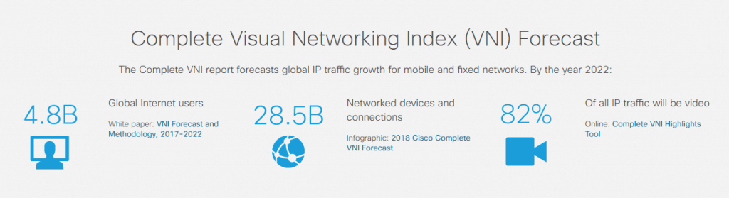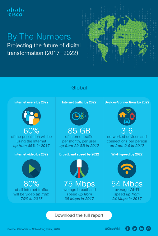 시스코 VNI 보고서에 따르면, 2017년부터 오는 2022년까지 5년간 발생할 인터넷 프로토콜(IP) 트래픽이 인터넷 네트워킹이 시작된 이래 2016년 말까지 누적된 IP 트래픽을 초과할 것으로 전망된다.