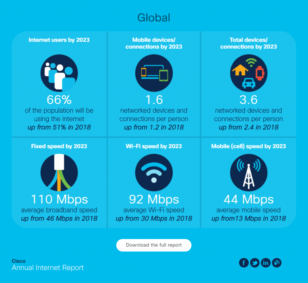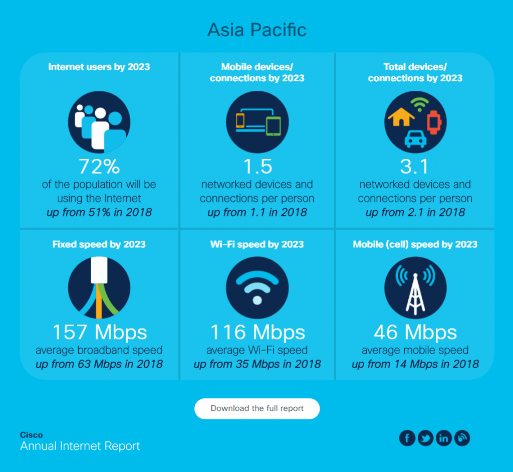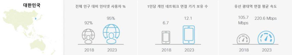 한편, 한국은 2018년 92%였던 전체 인구대비 인터네 사용자가 2023년이 되면 95%로 증가한다. 또 1인당 개인 네트워크 연결 기기 보유 수도 2018년 6.7개에서 2023년 12.1개로 많아진다. 유선 광대역 연결 평균 속도는 2018년 105.7Mbps에서 2023년 220.6Mbps로 빨라진다.