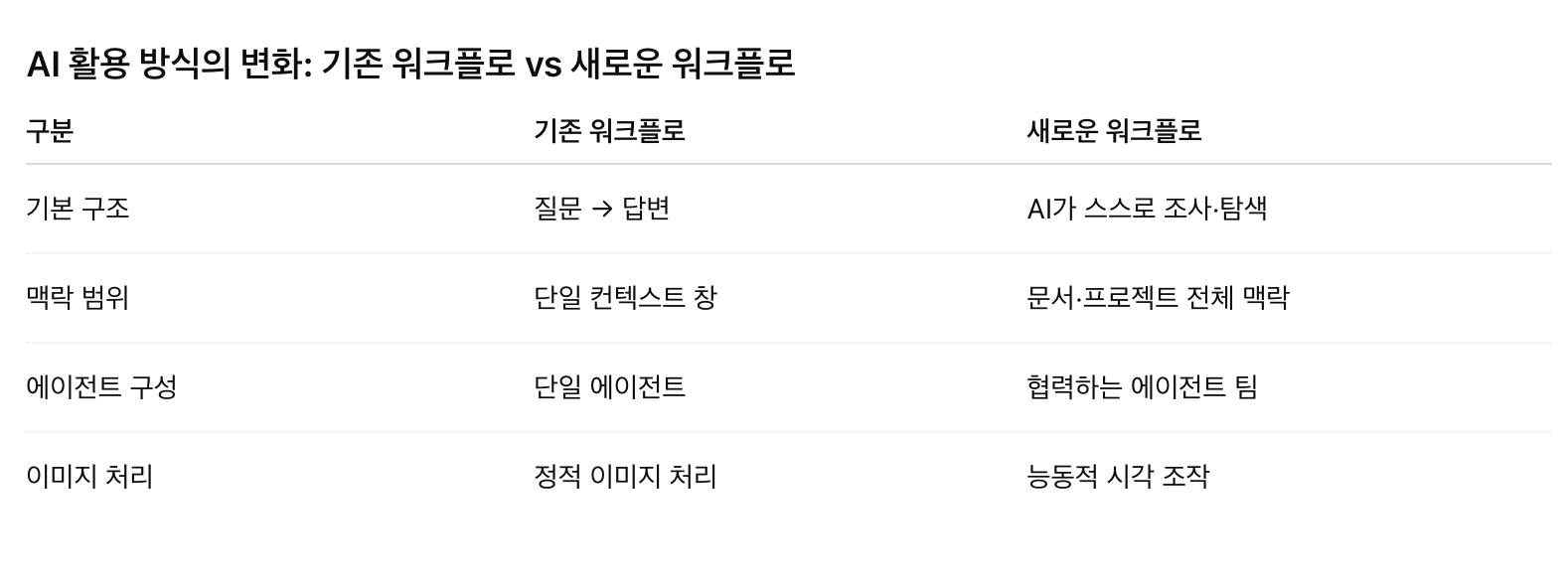 특히 AI가 다루는 맥락의 범위가 크게 넓어졌다는 점이 주목된다. 기존에는 하나의 질문과 하나의 답변이 중심이었지만, 이제는 문서나 프로젝트 전체를 전제로 작업이 이뤄진다. 단일 AI가 모든 일을 처리하던 방식에서 벗어나, 역할이 분담된 여러 에이전트가 협력하는 구조도 빠르게 확산되고 있다.