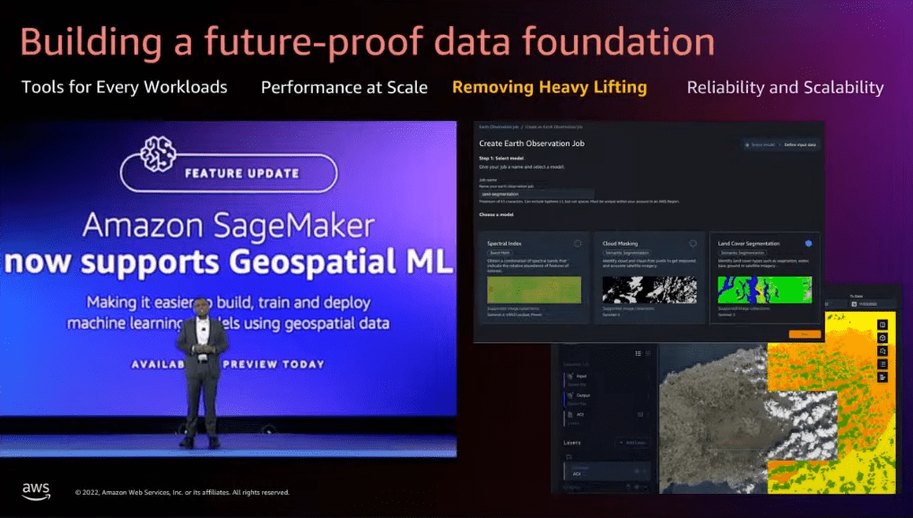 이제 아마존 세이지메이커는 고객이 데이터 세트를 보강하고, 지리공간 모델을 훈련하고, 몇 달이 아닌 몇 시간 만에 결과를 시각화할 수 있도록 하여 지리공간 ML 예측 생성을 가속화하고 단순화한다. 고객은 몇 번의 클릭만으로 또는 API를 사용하여, 아마존 세이지메이커를 통해 AWS(예: 아마존 로케이션 서비스), 신뢰할 수 있는 서드파티 공급자(예: 플래닛 랩스), 오픈소스 데이터 세트(예: 아마존 오픈 데이터)의 다양한 지리공간 데이터 소스에 액세스할 수 있다. 실무자가 사용하고자 하는 데이터 세트를 선택하면 내장 연산자를 활용하여 이러한 데이터 세트를 자체 데이터와 결합할 수 있다. 모델 개발 속도를 높이기 위해, 아마존 세이지메이커는 정밀 농업으로 작물 수확량 증가, 자연재해 피해 지역 모니터링, 도시 계획 개선과 같은 사용 사례를 위해 사전 훈련된 딥 러닝 모델에 대한 액세스를 자동으로 제공한다. 훈련 후 내장된 시각화 도구는 지도에 데이터를 표시하여 새로운 예측을 발견한다. 아마존 세이지메이커의 새로운 지리공간 기능에 대한 자세한 내용은 aws.amazon.com/sagemaker/geospatial에서 확인할 수 있다.