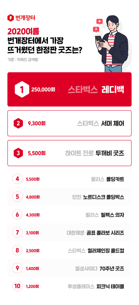 취향 기반 중고 거래 플랫폼 번개장터가 지난 5월 1일부터 8월 22일까지의 거래 데이터를 바탕으로 ‘브랜드 굿즈 중고 거래 및 검색 트렌드’를 발표했다. 이번 데이터는 키워드 검색량 1,000건 이상을 기록한 브랜드 굿즈를 기준으로 집계했다.