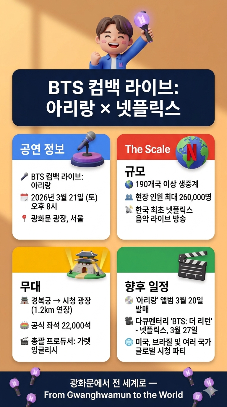 공연 일주일 뒤인 3월 27일에는 BTS의 군 복귀부터 완전체 귀환까지의 과정을 담은 다큐멘터리 〈BTS: 더 리턴(The Return)〉이 넷플릭스를 통해 공개된다. 공연 → 앨범 → 다큐멘터리로 이어지는 콘텐츠 구성은 넷플릭스와 하이브 양사가 BTS 컴백을 단순한 '공연 이벤트'가 아닌 하나의 '서사적 경험'으로 설계했음을 보여준다.