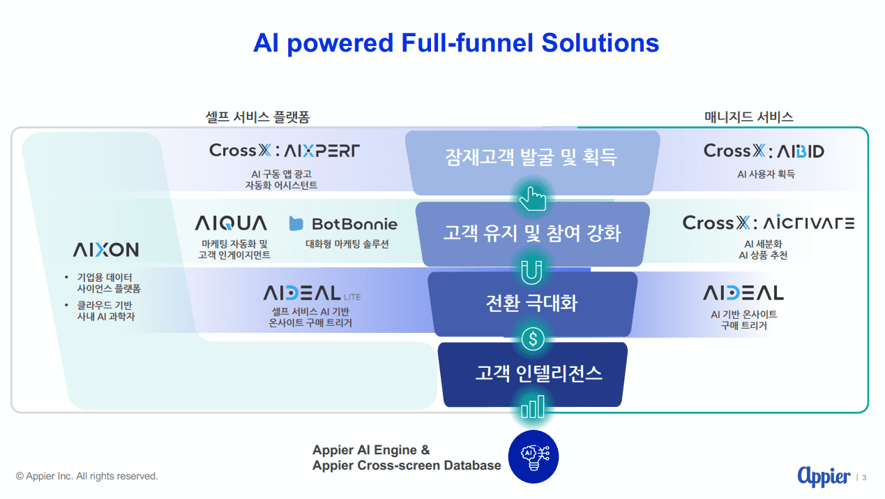 이를 통해 데이터를 관리하고 AI를 통해 데이터 활용을 극대화할 수 있다. 마케팅 퍼널 단계별로 필요한 제품군들이 준비되어 있고 아익슨은 가장 근간이 되는 인프라다.