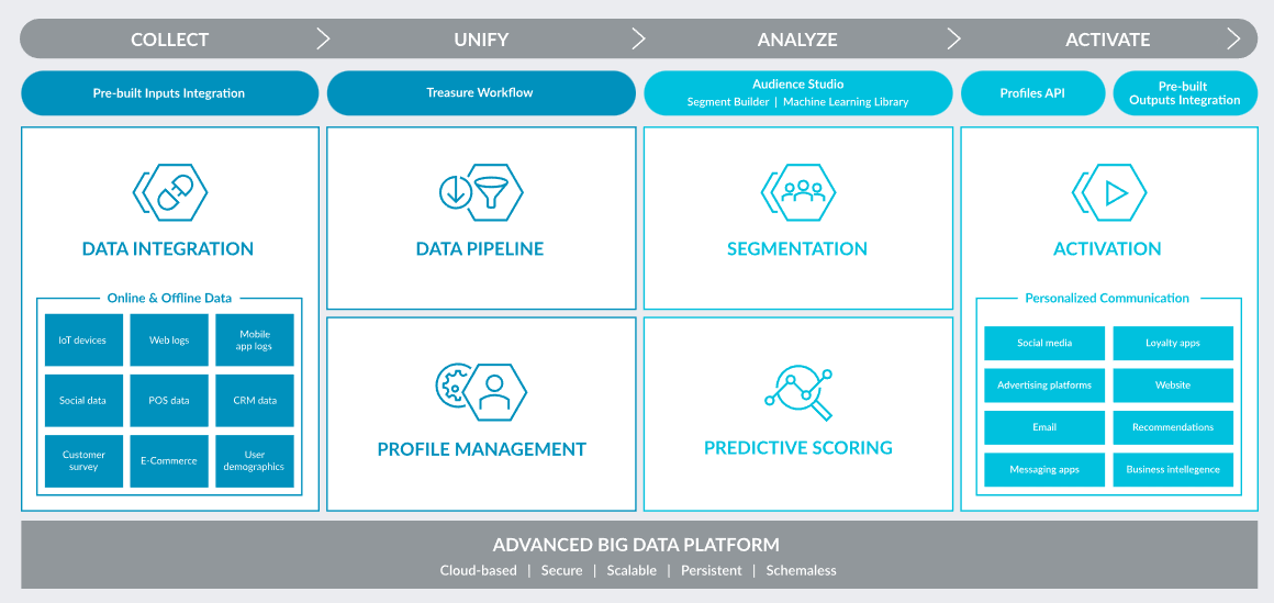 AWS에 입점된 트레저데이터 스마트 CDP(Treasure Data smart CDP)는 마케팅, 영업, 고객 서비스 분야에서 전사적으로 통합된 데이터, 인사이트, 고객 참여 전략을 통해 개별 고객을 쉽고 명확하게 파악할 수 있도록 지원한다.