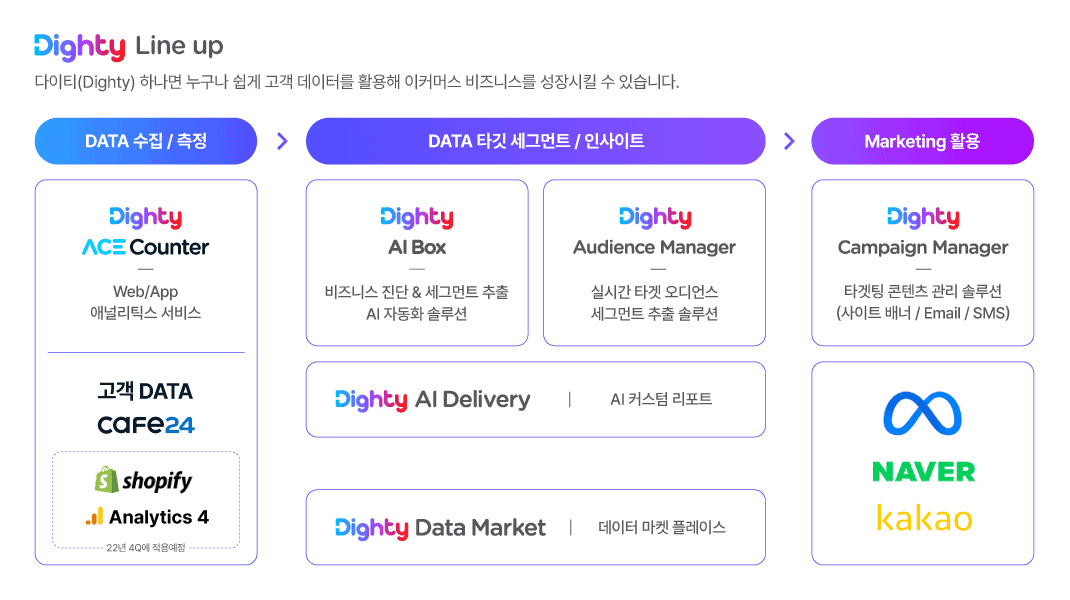 네 그렇습니다. 이전부터 로그 분석을 해 왔고 고객들의 비즈니스 활동 데이터를 잘 수집, 처리, 분석하고 최적화된 마케팅 활동을 지원하는 액션까지 한 사이클로 볼 수 있는데 저희는 오랫동안 이 분야에서 활동해 왔죠. 에이스카운터라는 솔루션 사업을 20년 동안 해오면서 축적한 역량을 기반으로 더 필요한 기능들을 더해서 다이티를 1년 전에 출시했습니다.