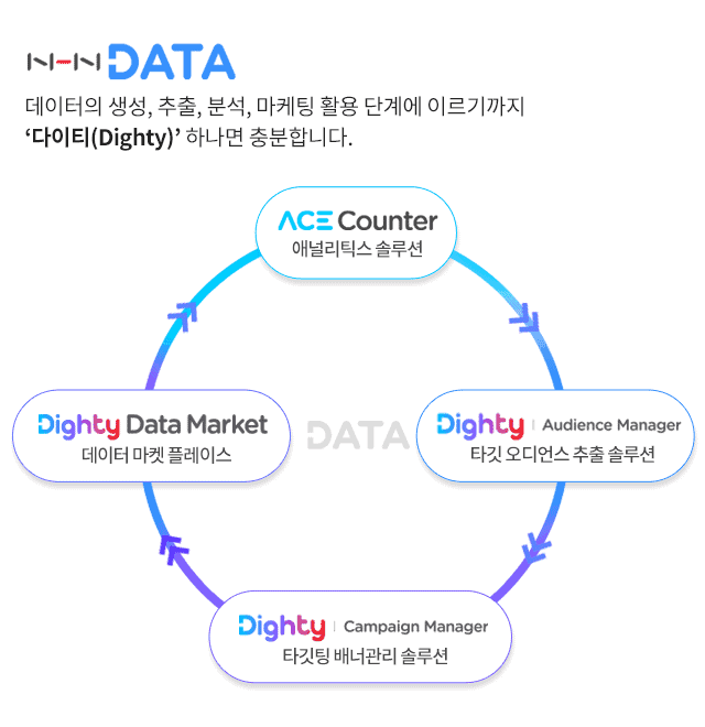 NHN DATA가 제공하는 CDP 서비스는‘다이티(Dighty).’ 2019년 첫 선을 보인 후 ‘다이티’는 ▲웹로그 분석 서비스 ‘에이스카운터’ ▲타겟 오디언스 추출 솔루션 ‘다이티 오디언스 매니저’ ▲타겟팅 배너 관리 솔루션 ‘다이티 캠페인 매니저’ ▲데이터 허브 역할의 ‘다이티 데이터 마켓’ 등 총 4가지 라인업으로 보강했다.