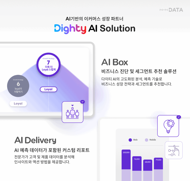 ‘다이티 AI박스’는 AI가 커머스 사이트의 구매 데이터를 분석, 예측해 고객 특성을 진단하고 맞춤식 성장 전략을 제시하는 솔루션이다. 고객의 비즈니스 특성을 36개 유형으로 분류하는 ‘DBTI(Dighty e-Business Type Indicator)’ 기술이 적용됐으며, 해당 기술은 이달 특허 출원을 완료했다. 솔루션은 DBTI 진단을 기반으로 첫 구매, 반복 구매 등 고객 사이클에 맞춰 비즈니스 성장 전략을 제안하고, 전략 실행을 위한 맞춤형 타겟 그룹을 추천한다. 해당 그룹을 소셜 미디어와 전자우편 등 다양한 마케팅 채널에 활용할 수 있도록 솔루션 내 연동도 지원한다.