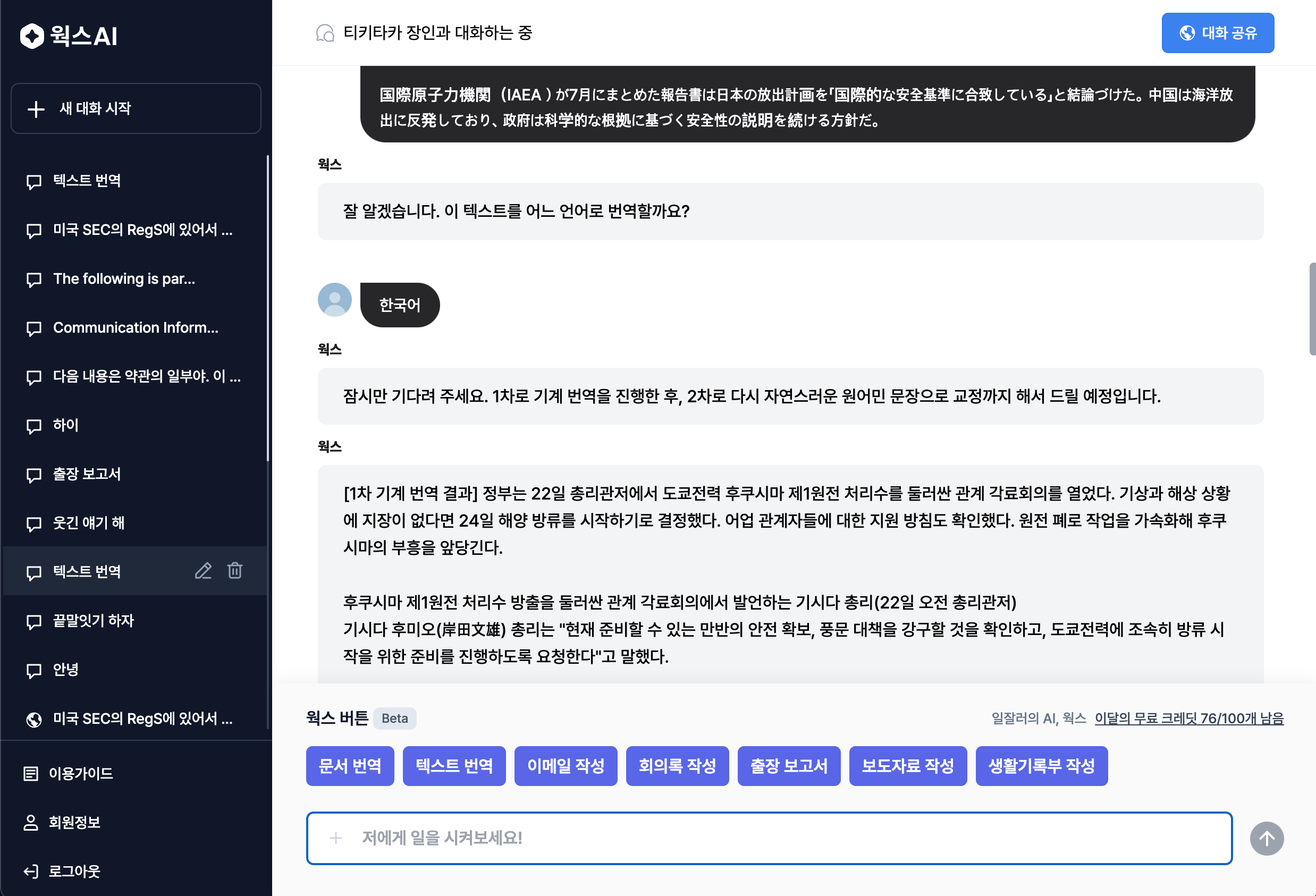 (웍스의 텍스트 번역 모습. 1차로 AI 번역 후, 2차로 원어민 교정까지 해서 제공된다.)