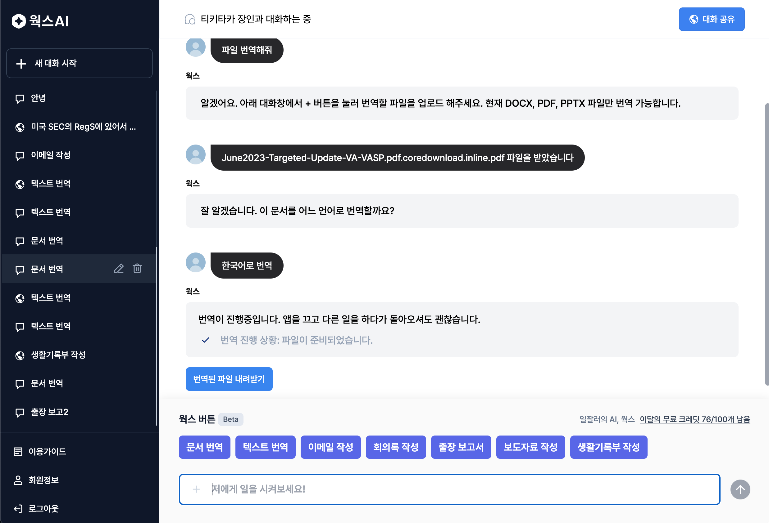 (웍스에서 문서 번역을 사용하는 모습. 영문 PDF를 올려 한글 PDF로 내려 받을 수 있다.)