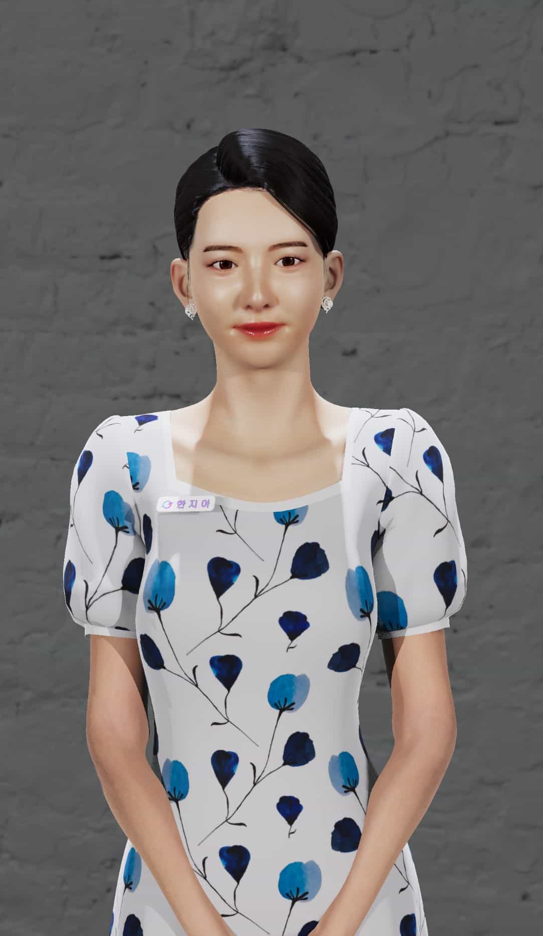 또 과학기술정보통신부의 지원 하에 한국전자통신연구원(ETRI)과 공동 연구 및 제품 개발을 진행 중인 '실사 수준의 디지털 휴먼 생성과 30fps급 실감 렌더링 기술 개발' 과제의 성과가 적용되어 더욱 실제에 가까운 외형과 움직임을 선보일 수 있게 됐다. 한지아는 부스 안내와 가상인간 제작 체험존의 일정 예약 업무를 담당한다.