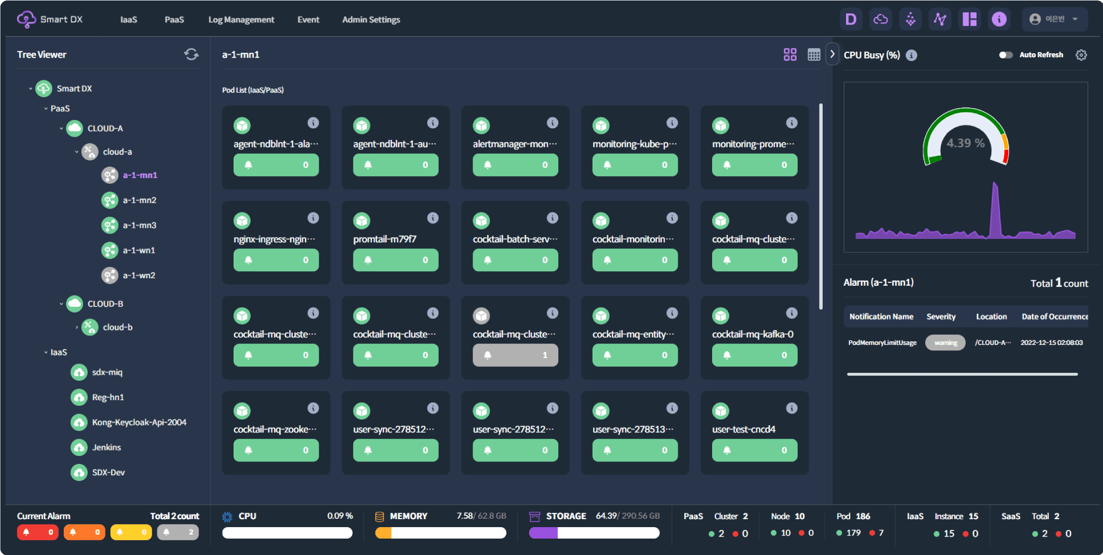 국내 최초로 개발된 클라우드 서비스 통합 관리와 운영 제품인 ‘스마트 DX 솔루션’은 제품 기획 초기부터 멀티/하이브리드 클라우드 지원, 웹 GUI 기반의 사용 편의성, 인프라스트럭처부터 애플리케이션에 이르기까지 상세한 모니터링에 기반을 둔 제품으로 클라우드 기반의 디지털 전환 핵심 기술이 총 집약됐다.