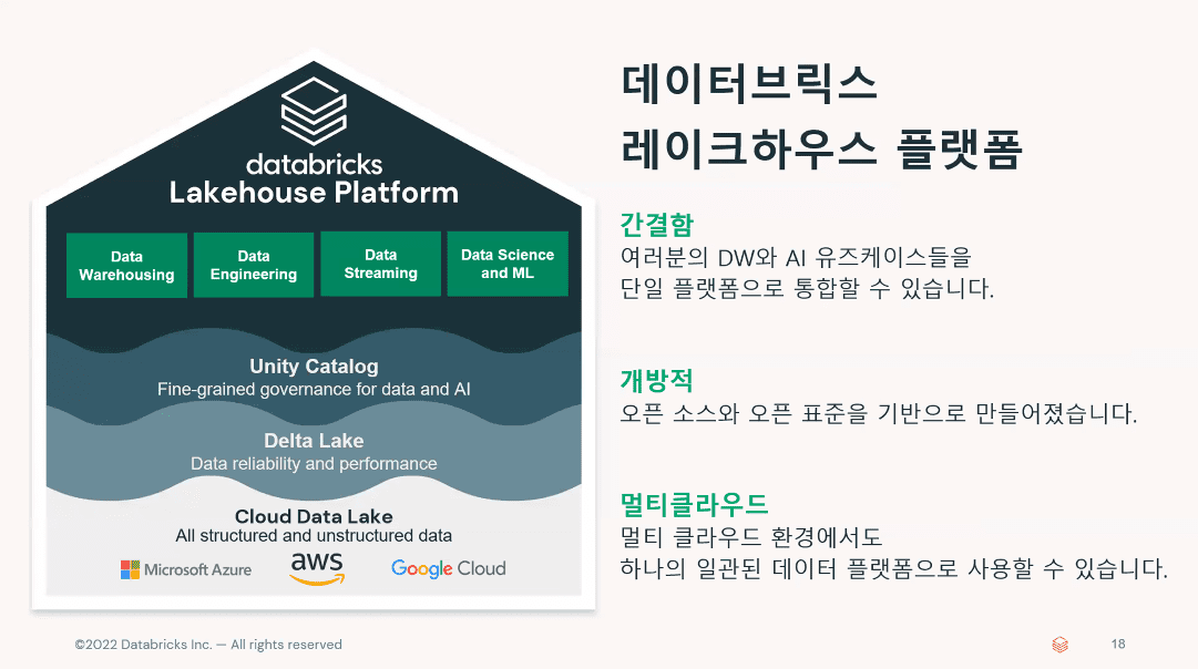 [테크수다 기자 도안구 eyeball@techsuda.com] "정형 데이터와 비정형 데이터를 위한 별도의 데이터 플랫폼을 만들 필요가 없습니다. 데이터블릭스의 레이크하우스(Lakehouse)는 단일한 통합 플랫폼에서 데이터웨어하우징과 비즈니스 인텔리전스(BI), 데이터 엔지니어링, 인공지능과 머신러닝 (AI/ML) 워크로드에 이르기까지 모든 데이터와 분석 요구를 지원합니다. 특정 클라우드 사업자에 락인되지 않고 간편하고 유연합니다."