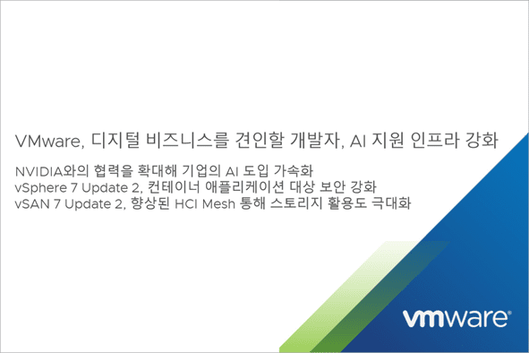 VM웨어 v스피어 7 업데이트 2는 델 테크놀로지스(Dell Technologies), HPE, 레노버(Lenovo), 슈퍼마이크로(Supermicro)와 마찬가지로 엔비디아 인증 시스템(NVIDIA Certified System)에서 엔비디아 A100 텐서 코어 GPU 인증을 획득했다. 해당 인증을 통해 엔비디아 AI 엔터프라이즈 라이선스를 획득한 v스피어 고객에 엔비디아의 직접적인 고객 지원을 제공한다.
