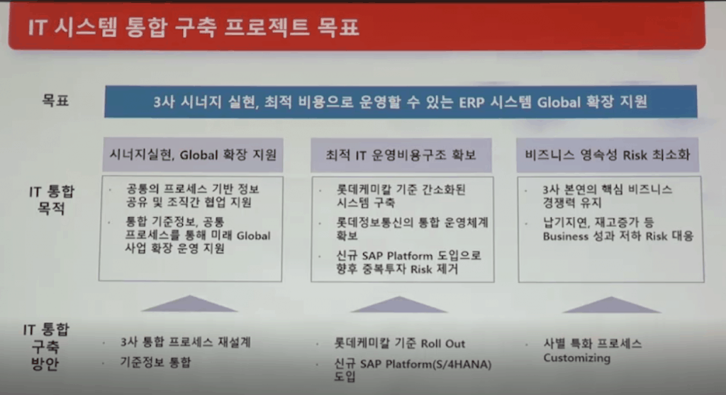 10년동안 운영하던 기존 롯데케미칼 시스템과 인수합병한 두 회사의 시스템에 대한 최적의 IT 운영 비요 구조를 확보하기 위해 간소화된 시스템을 구축하고 롯데정보통신이 통합 운영체계를 확보하고 신규 SAP 플랫폼 도읍으로 중복 투자 리스트를 제거토록했다. 이를 위해 롯데케미칼 기준 롤아웃형태로 프로젝트를 진행하고 신규 SAP S/4 HANA를 도입했다.
