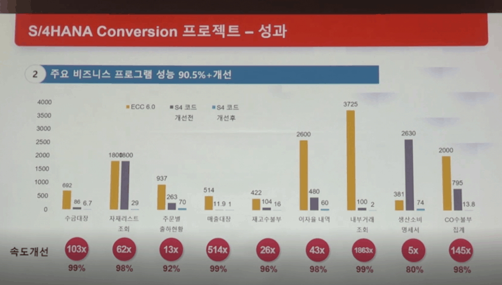 주요 비즈니스 프로그램 성능도 90.5% 개선되었다. 인메모리 기반 제품의 경쟁력이었다. 그는 1년간 40만 건 가량의 매출 대장을 조회할 때 예전에는 그걸 볼 수 있을까 하는 생각이 들었었는데 프로젝트 후 2분만에 관련 자료가 올라오는 걸 보고 성능을 체감했다고 전했다. 당연히 회계부서에서도 많은 업무 시간이 단축되면서 프로젝트 팀에 박수를 보냈다고.
